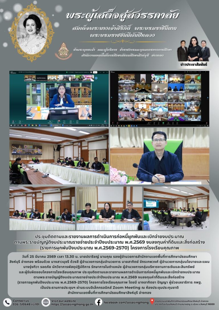 ประชุมติดตามและรายงานผลการดำเนินการก่อหนี้ผูกพันและเบิกจ่ายงบประมาณ ตามพระราชบัญญัติงบประมาณรายจ่ายประจำปีงบประมาณ พ.ศ.2569 งบลงทุนค่าที่ดินและสิ่งก่อสร้าง (รายการผูกพันปีงบประมาณ พ.ศ.2569-2570) โครงการโรงเรียนคุณภาพ25 มีนาคม 2026โดยประชาสัมพันธ์วันที่25 มีนาคม 2026Read more→
