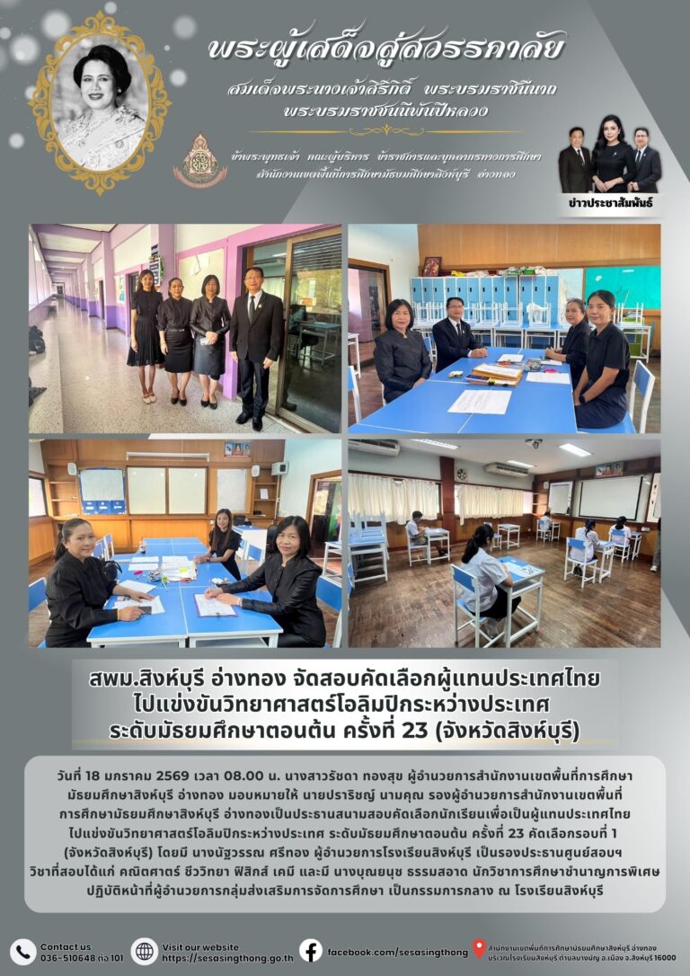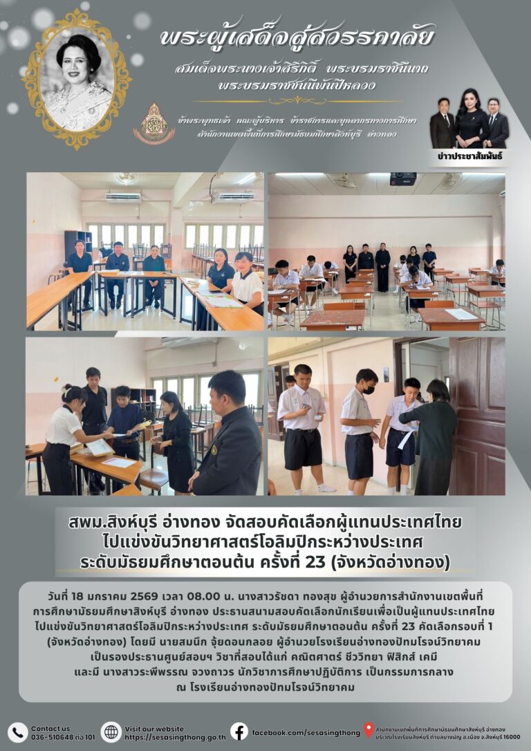 สพม.สิงห์บุรี อ่างทอง จัดสอบคัดเลือกผู้แทนประเทศไทย ไปแข่งขันวิทยาศาสตร์โอลิมปิกระหว่างประเทศ ระดับมัธยมศึกษาตอนต้น ครั้งที่ 23 (จังหวัดสิงห์บุรี)18 มกราคม 2026โดยประชาสัมพันธ์วันที่18 มกราคม 2026Read more→