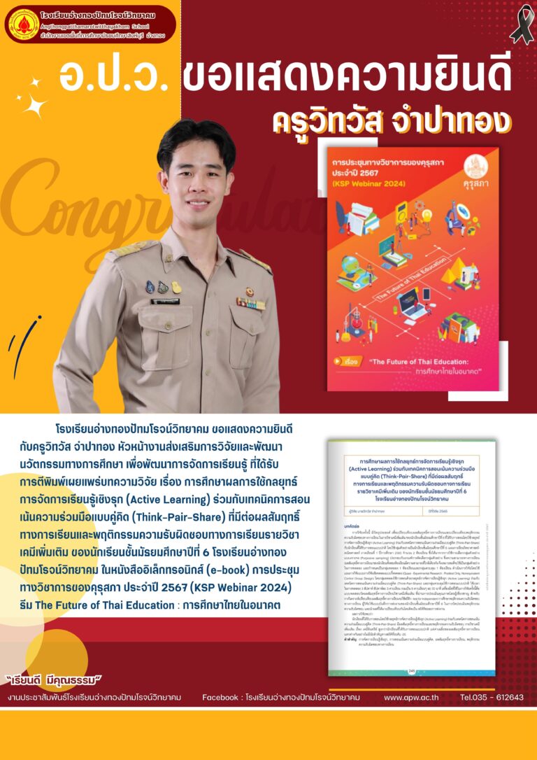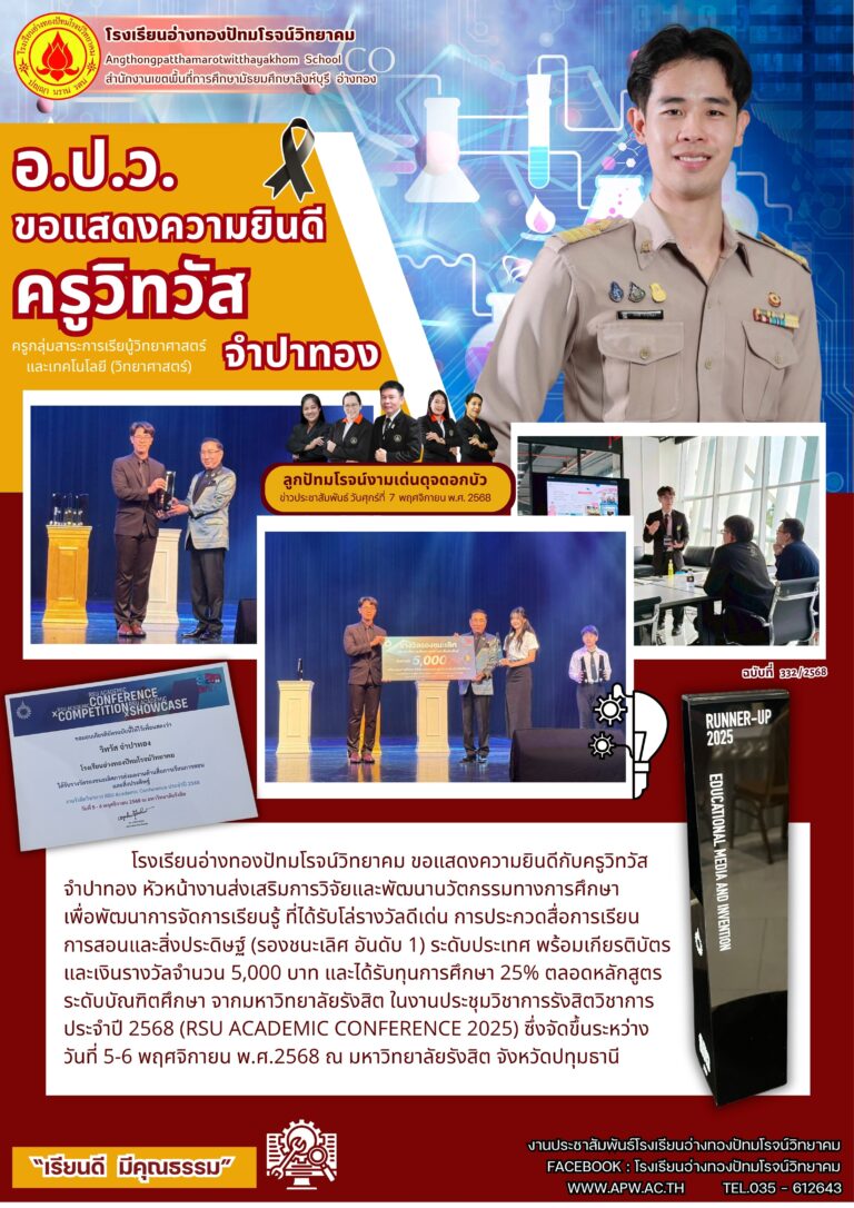 อ.ป.ว. ขอแสดงความยินดีครูวิทวัส จำปาทอง7 พฤศจิกายน 2025โดยโรงเรียนอ่างทองปัทมโรจน์วิทยาคมวันที่7 พฤศจิกายน 2025Read more→