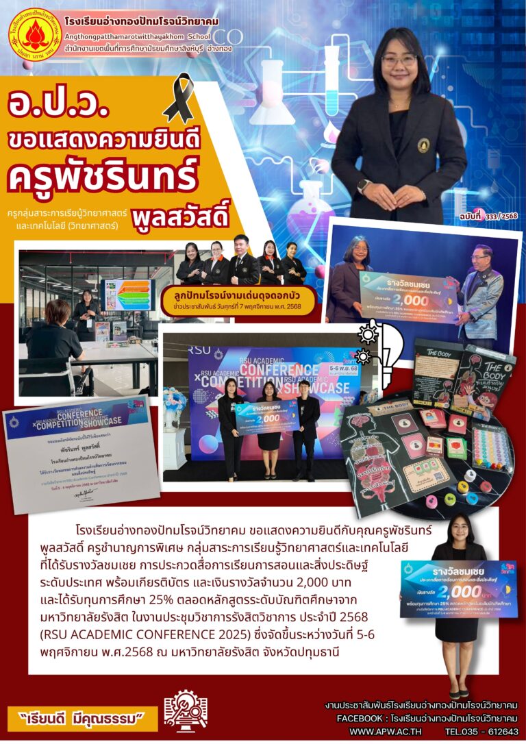 อ.ป.ว. ขอแสดงความยินดีครูพัชรินทร์ พูลสวัสดิ์11 พฤศจิกายน 2025โดยโรงเรียนอ่างทองปัทมโรจน์วิทยาคมวันที่11 พฤศจิกายน 2025Read more→