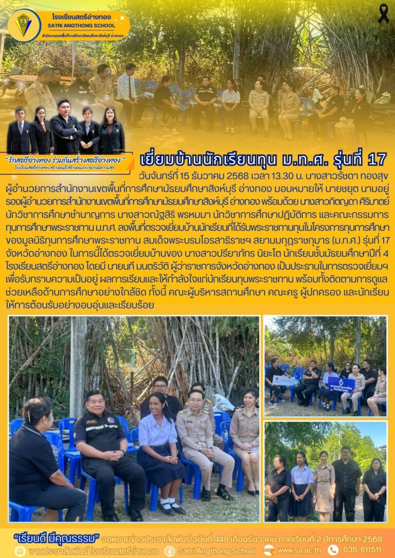 ต้อนรับคณะทำงานลงพื้นที่ตรวจเยี่ยมบ้านนักเรียนที่ได้รับพระราชทานทุน (ม.ท.ศ.) รุ่นที่ 1724 ธันวาคม 2025โดยโรงเรียนสตรีอ่างทองวันที่24 ธันวาคม 2025Read more→