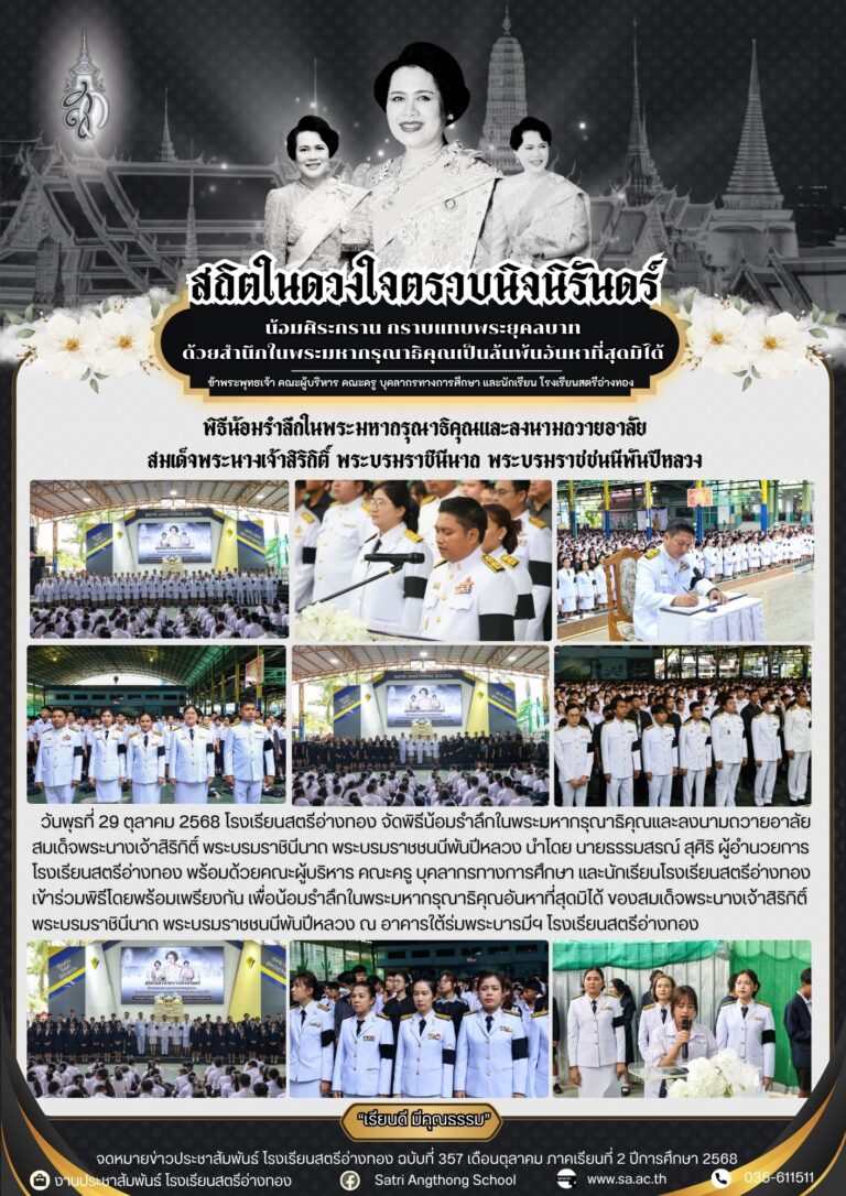 พิธีน้อมรำลึกในพระมหากรุณาธิคุณและลงนามถวายอาลัย สมเด็จพระนางเจ้าสิริกิติ์ พระบรมราชินีนาถ พระบรมราชชนนีพันปีหลวง30 ตุลาคม 2025โดยโรงเรียนสตรีอ่างทองวันที่30 ตุลาคม 2025Read more→