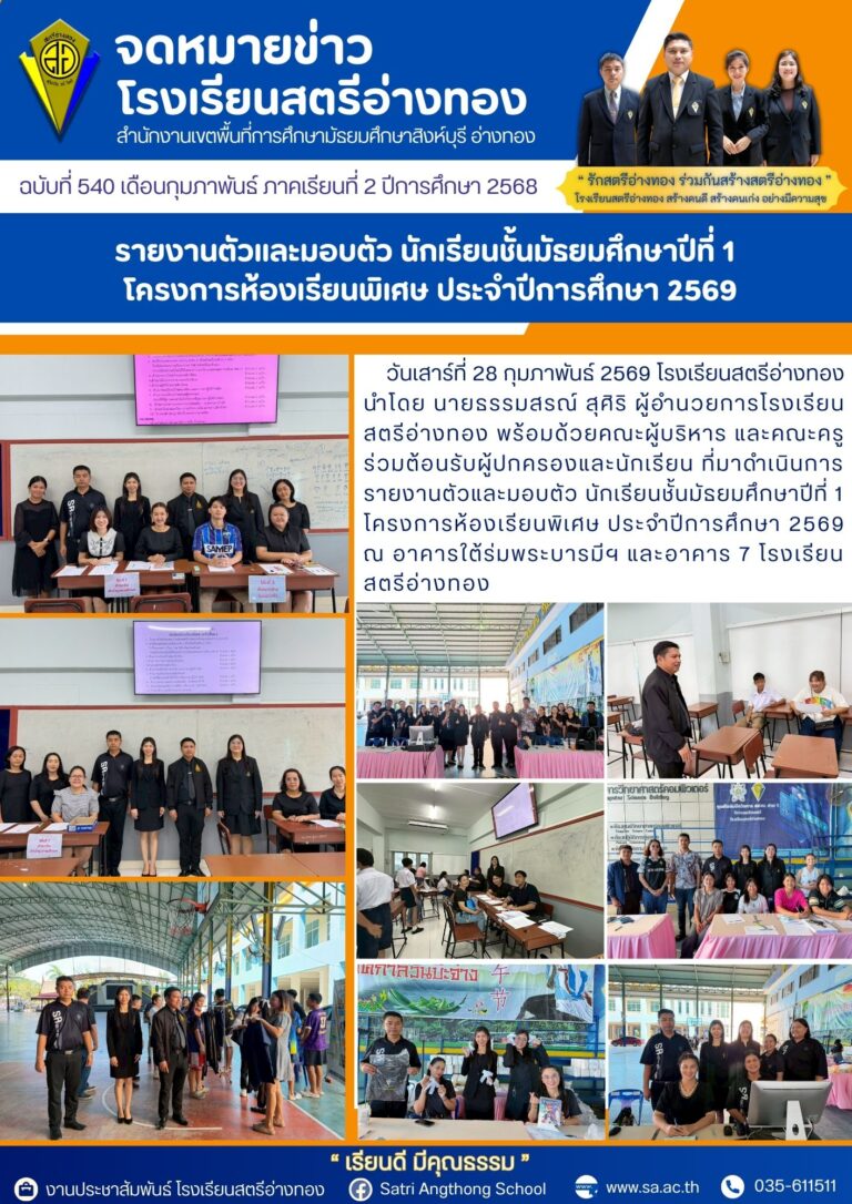 รายงานตัวและมอบตัว นักเรียนชั้นมัธยมศึกษาปีที่ 4 โครงการห้องเรียนพิเศษ ประจำปีการศึกษา 25692 มีนาคม 2026โดยโรงเรียนสตรีอ่างทองวันที่2 มีนาคม 2026Read more→