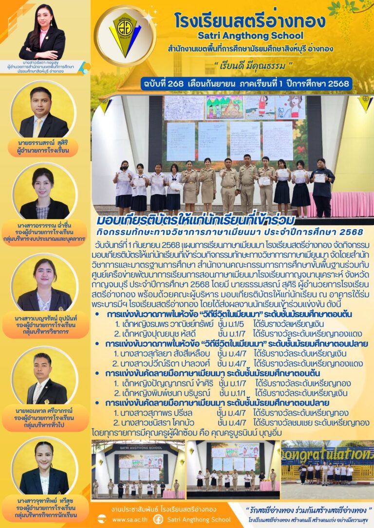 มอบเกียรติบัตรให้แก่นักเรียนที่เข้าร่วม กิจกรรมทักษะทางวิชาการภาษาเมียนมา ประจำปีการศึกษา 25682 กันยายน 2025โดยโรงเรียนสตรีอ่างทองวันที่2 กันยายน 2025Read more→