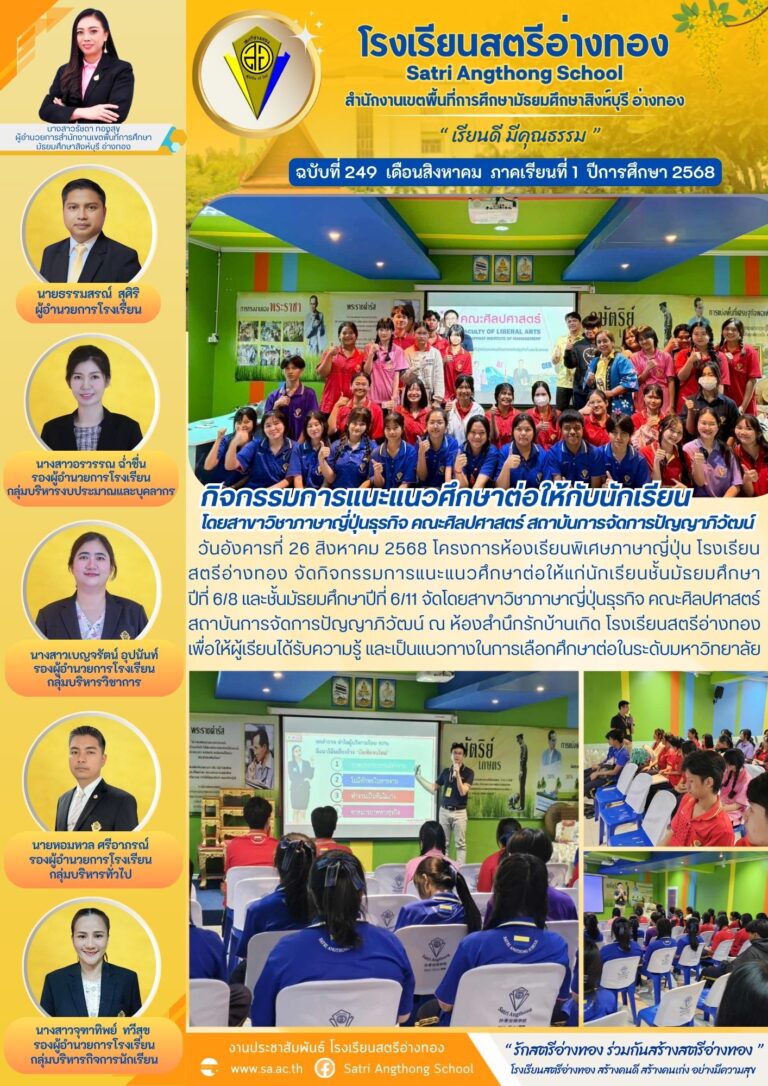 กิจกรรมการแนะแนวศึกษาต่อให้กับนักเรียน โดยสาขาวิชาภาษาญี่ปุ่นธุรกิจ คณะศิลปศาสตร์ สถาบันการจัดการปัญญาภิวัฒน์28 สิงหาคม 2025โดยโรงเรียนสตรีอ่างทองวันที่28 สิงหาคม 2025Read more→