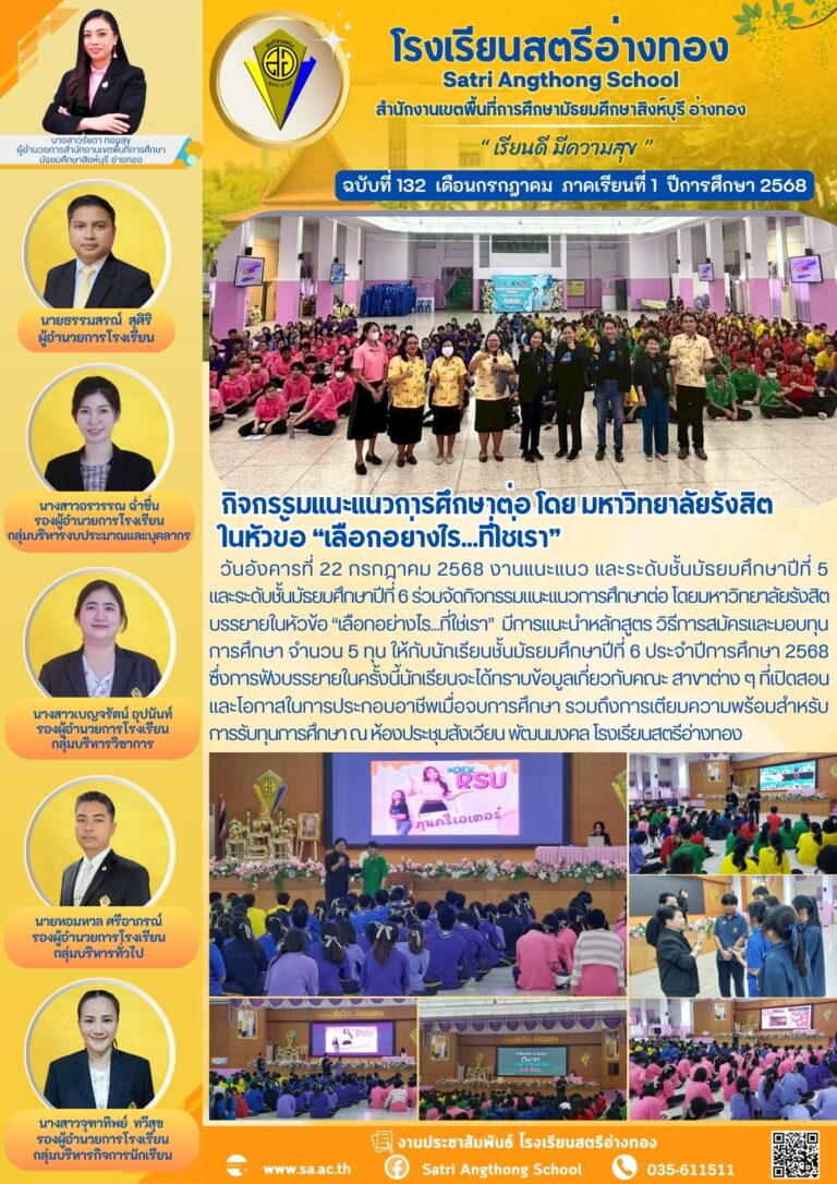 กิจกรรมแนะแนวการศึกษาต่อ โดย มหาวิทยาลัยรังสิต ในหัวข้อ “เลือกอย่างไร…ที่ใช่เรา”23 กรกฎาคม 2025โดยโรงเรียนสตรีอ่างทองวันที่23 กรกฎาคม 2025Read more→