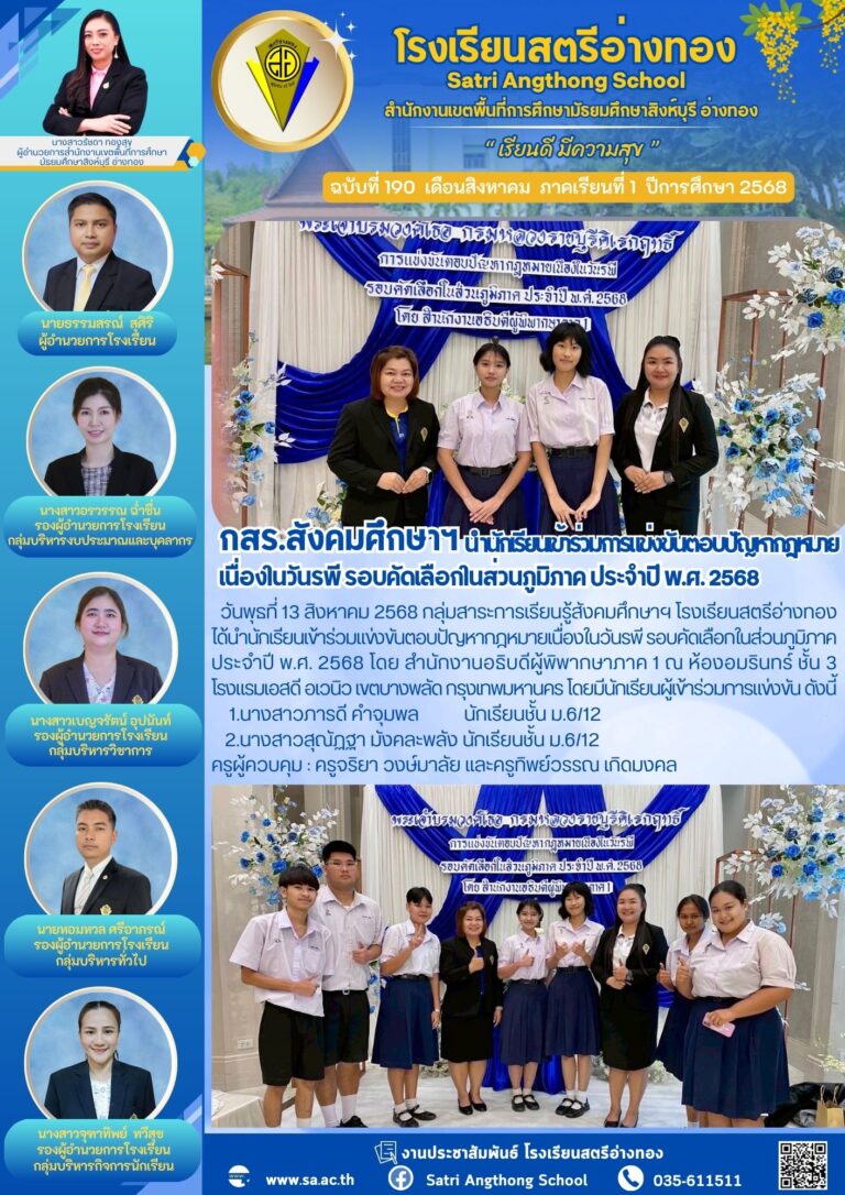 กสร.สังคมศึกษาฯ นำนักเรียนเข้าร่วมการแข่งขันตอบปัญหากฎหมาย เนื่องในวันรพี รอบคัดเลือกในส่วนภูมิภาค ประจำปี พ.ศ. 256814 สิงหาคม 2025โดยโรงเรียนสตรีอ่างทองวันที่14 สิงหาคม 2025Read more→
