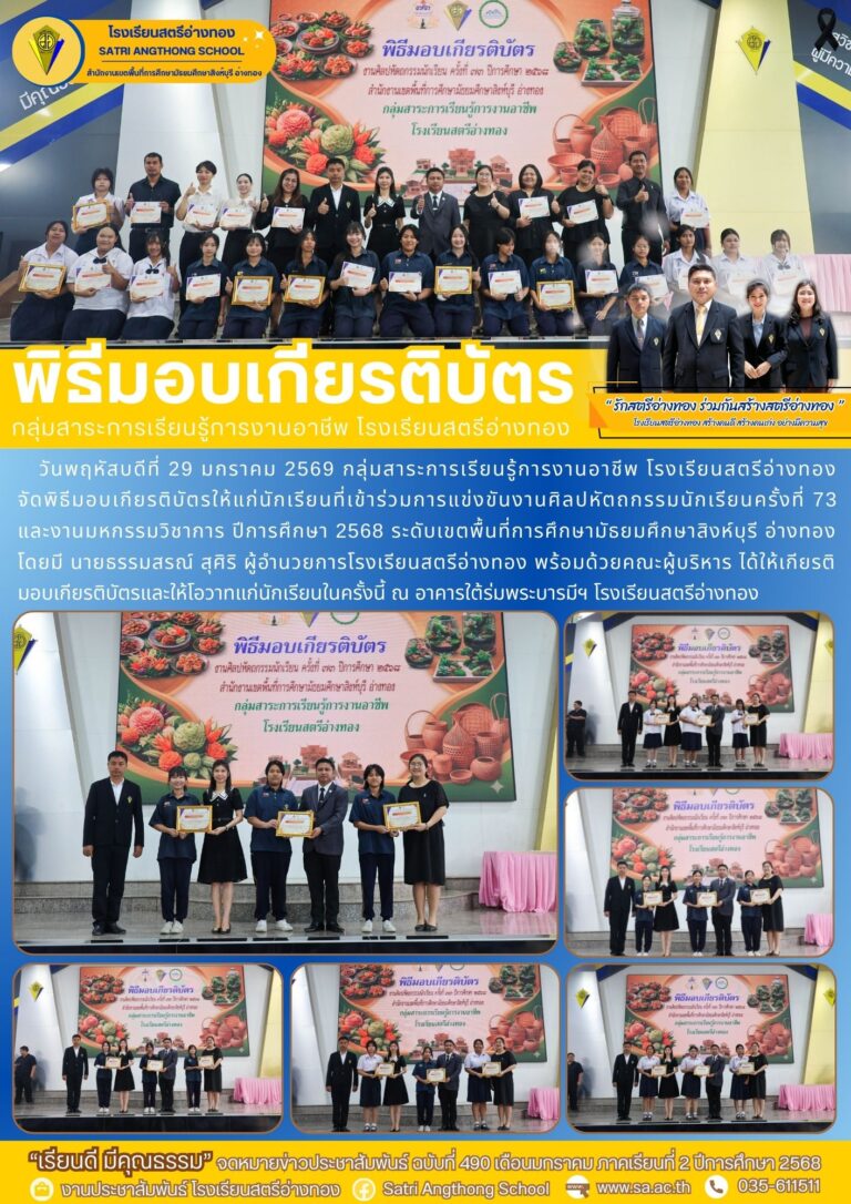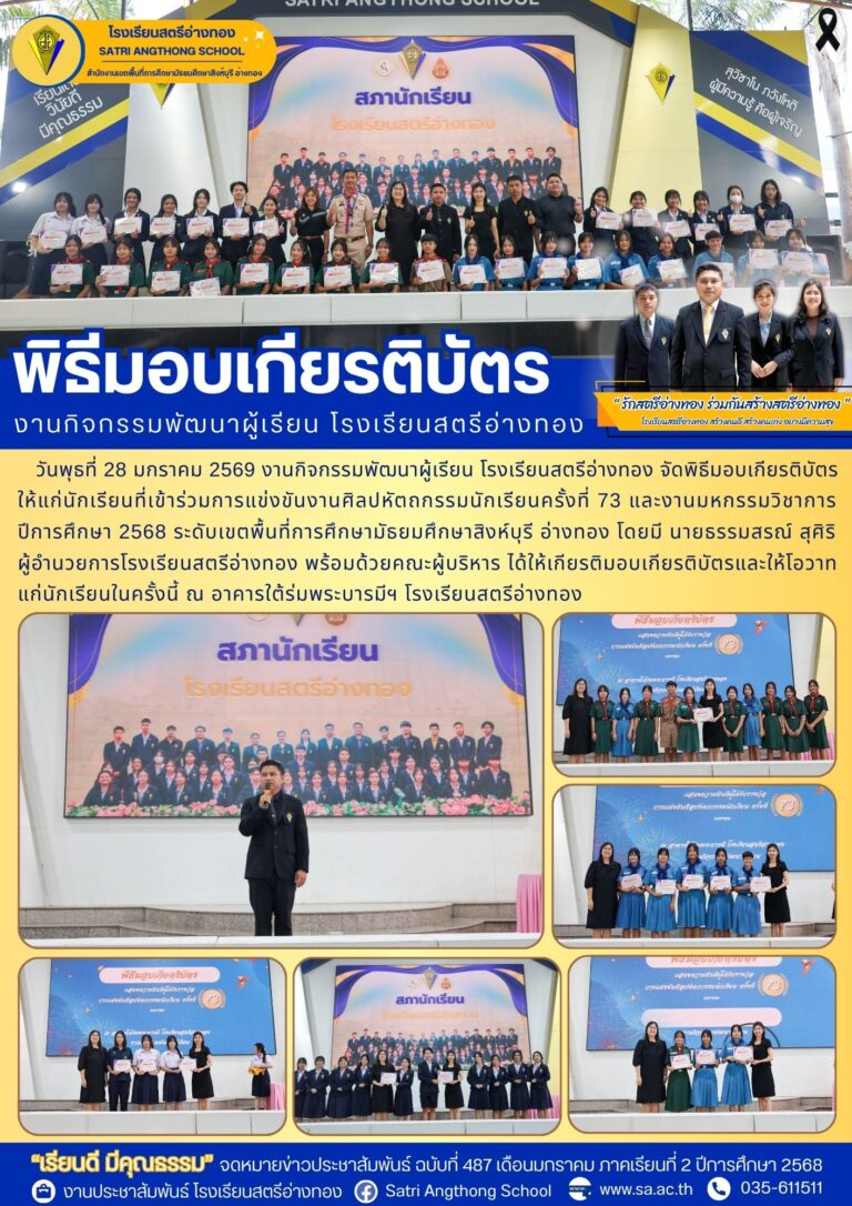 พิธีมอบเกียรติบัตร งานกิจกรรมพัฒนาผู้เรียน โรงเรียนสตรีอ่างทอง28 มกราคม 2026โดยโรงเรียนสตรีอ่างทองวันที่28 มกราคม 2026Read more→