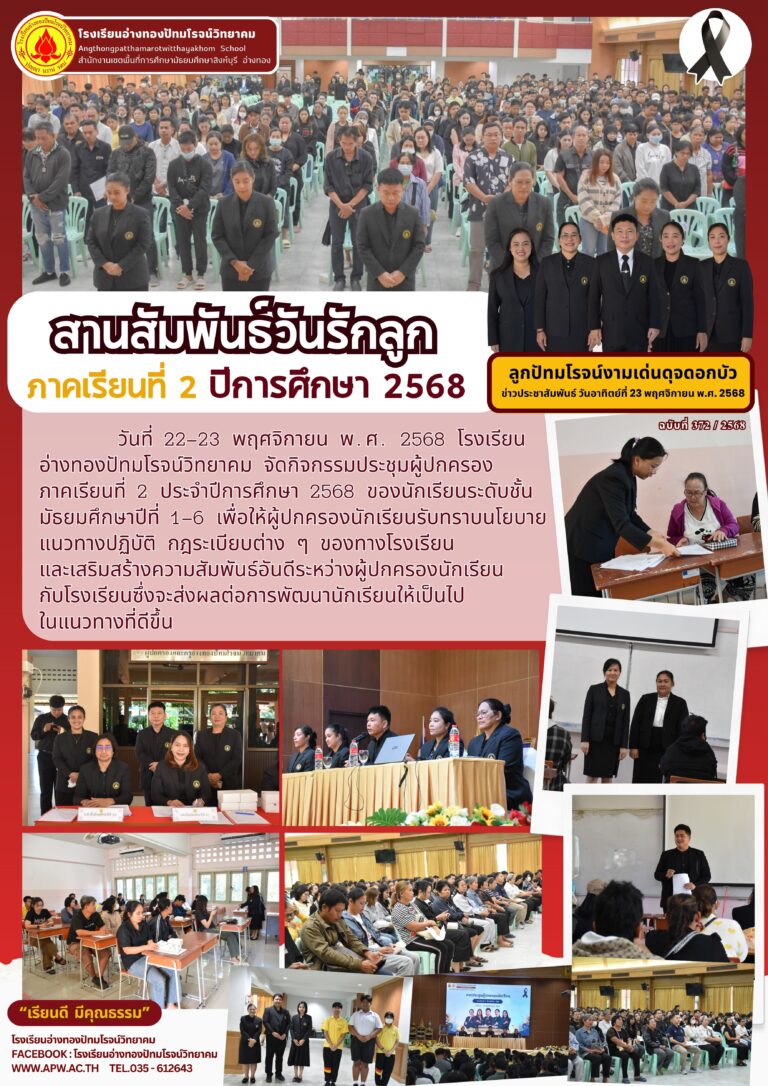สานสัมพันธ์วันรักลูก ภาคเรียนที่ 2 ปีการศึกษา 256824 พฤศจิกายน 2025โดยโรงเรียนอ่างทองปัทมโรจน์วิทยาคมวันที่24 พฤศจิกายน 2025Read more→