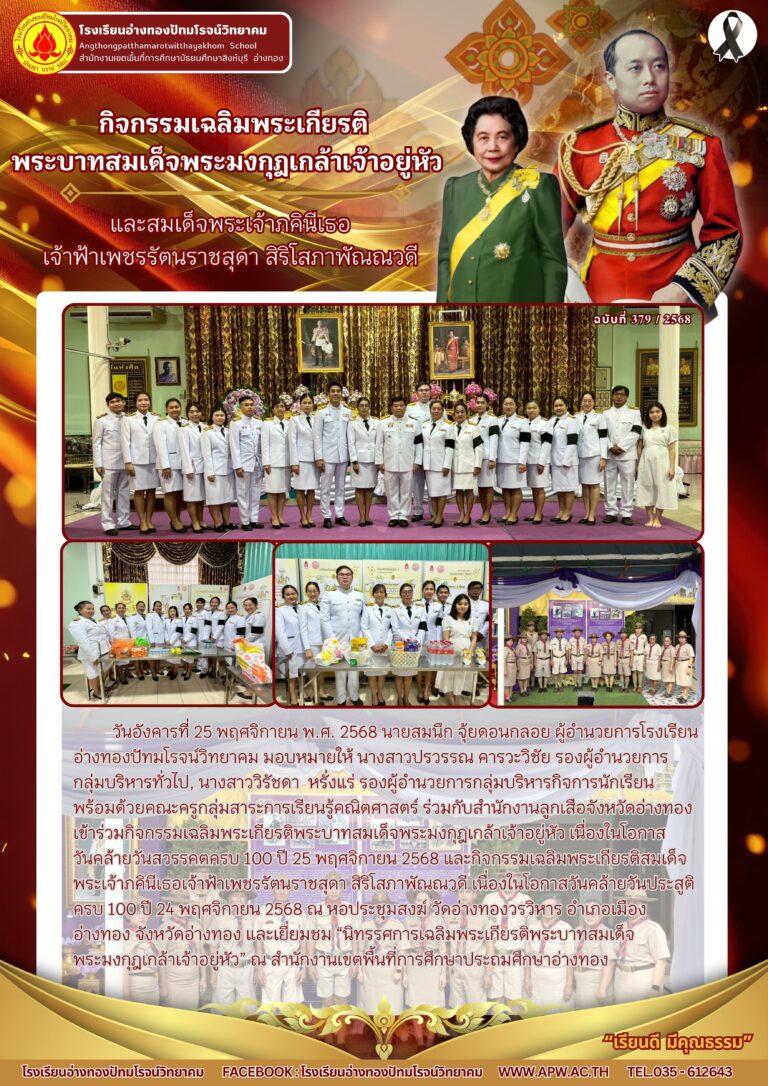 กิจกรรมเฉลิมพระเกียรติ พระบาทสมเด็จพระมงกุฎเกล้าเจ้าอยู่หัว และสมเด็จพระเจ้าภคินีเธอ เจ้าฟ้าเพชรรัตนราชสุดา สิริโสภาพัณณวดี26 พฤศจิกายน 2025โดยโรงเรียนอ่างทองปัทมโรจน์วิทยาคมวันที่26 พฤศจิกายน 2025Read more→