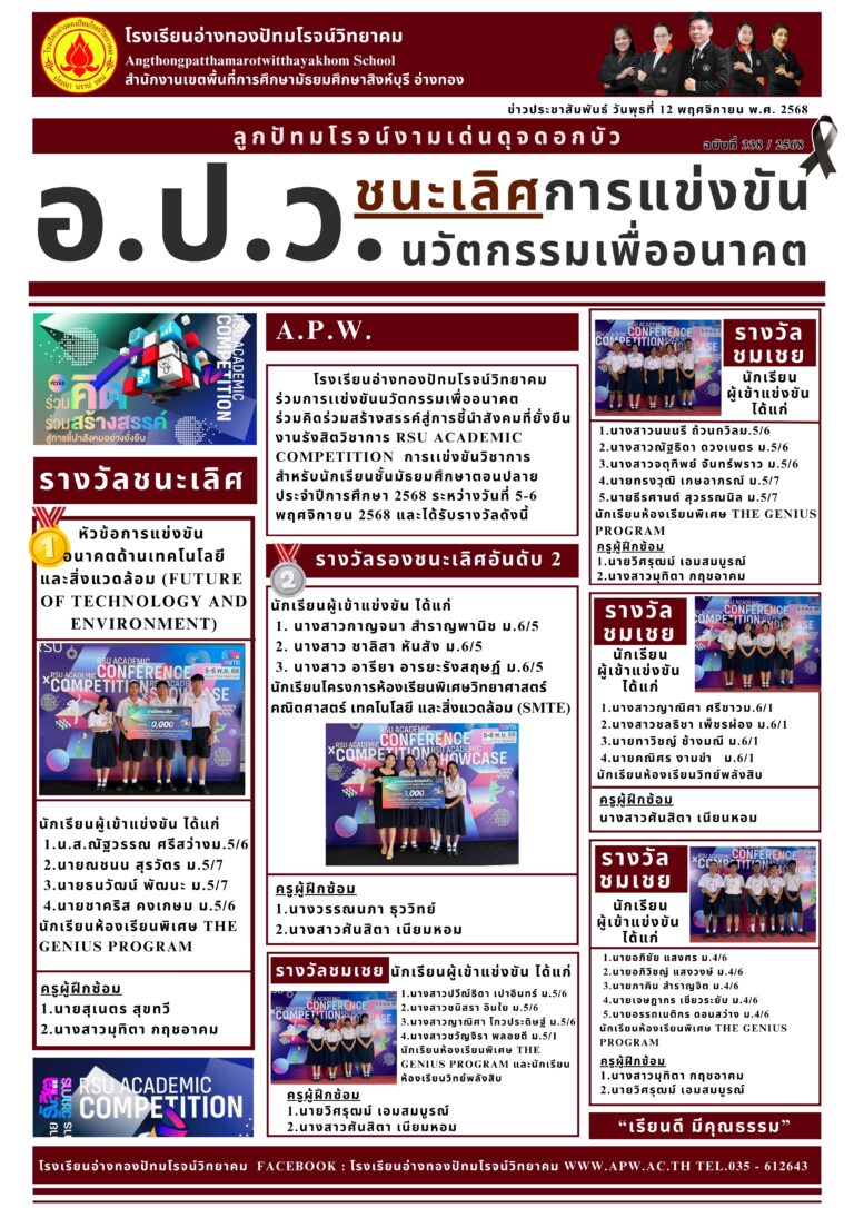 อ.ป.ว. ชนะเลิศการแข่งขันนวัตกรรมเพื่ออนาคต18 พฤศจิกายน 2025โดยโรงเรียนอ่างทองปัทมโรจน์วิทยาคมวันที่18 พฤศจิกายน 2025Read more→