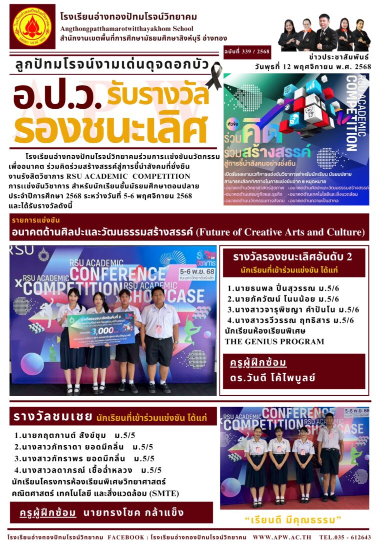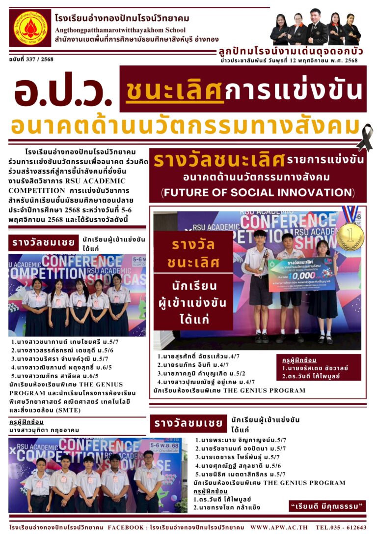 อ.ป.ว. ชนะเลิศการแข่งขันอนาคตด้านนวัตกรรมทางสังคม18 พฤศจิกายน 2025โดยโรงเรียนอ่างทองปัทมโรจน์วิทยาคมวันที่18 พฤศจิกายน 2025Read more→