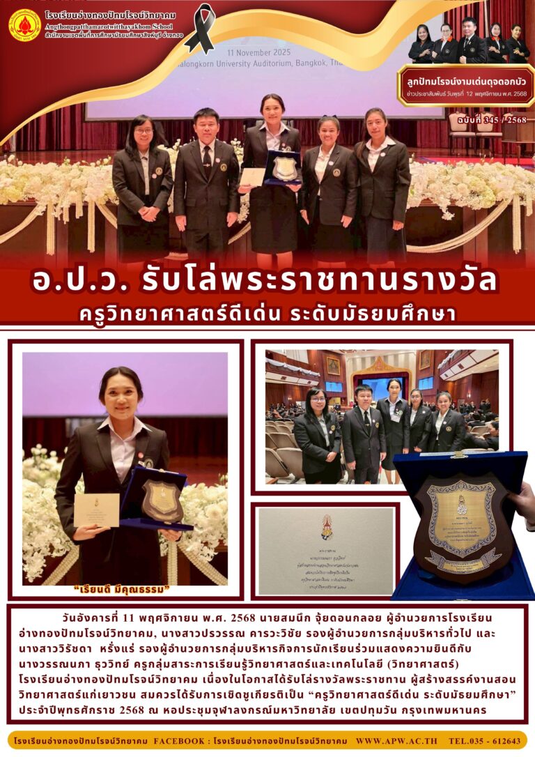 อ.ป.ว. รับโล่พระราชทานรางวัลครูวิทยาศาสตร์ดีเด่น ระดับมัธยมศึกษา24 พฤศจิกายน 2025โดยโรงเรียนอ่างทองปัทมโรจน์วิทยาคมวันที่24 พฤศจิกายน 2025Read more→