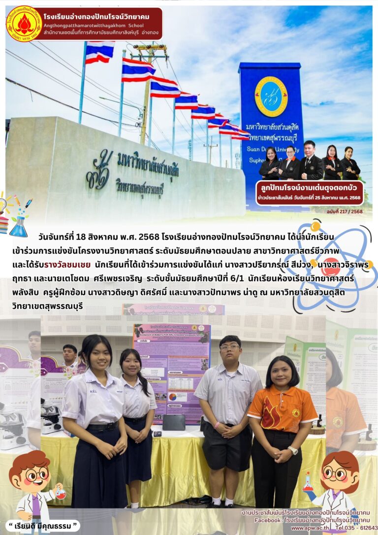 อ.ป.ว. เข้าร่วมการแข่งขันโครงงานวิทยาศาสตร์ ระดับมัธยมศึกษาตอนปลาย สาขาวิทยาศาสตร์ชีวภาพ4 กันยายน 2025โดยโรงเรียนอ่างทองปัทมโรจน์วิทยาคมวันที่4 กันยายน 2025Read more→