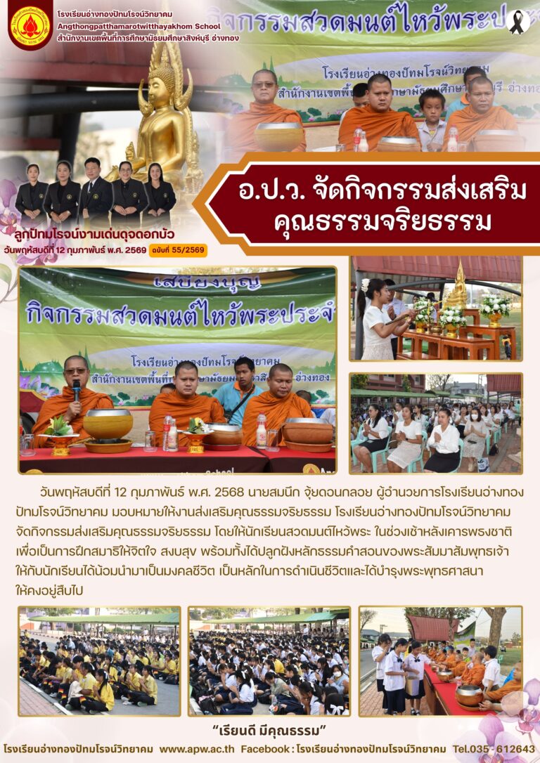 อ.ป.ว. จัดกิจกรรมส่งเสริมคุณธรรมจริยธรรม18 กุมภาพันธ์ 2026โดยโรงเรียนอ่างทองปัทมโรจน์วิทยาคมวันที่18 กุมภาพันธ์ 2026Read more→