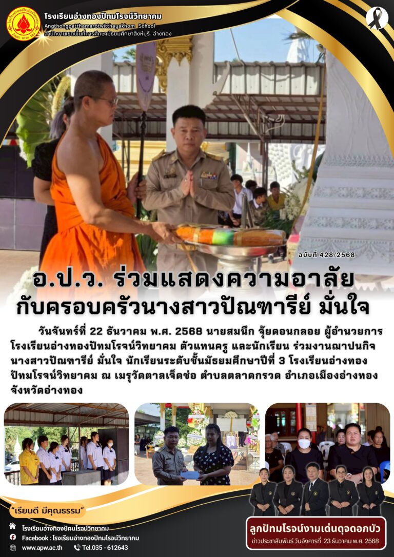 อ.ป.ว. ร่วมแสดงความอาลัยกับครอบครัวนางสาวปัณฑารีย์ มั่นใจ26 ธันวาคม 2025โดยโรงเรียนอ่างทองปัทมโรจน์วิทยาคมวันที่26 ธันวาคม 2025Read more→