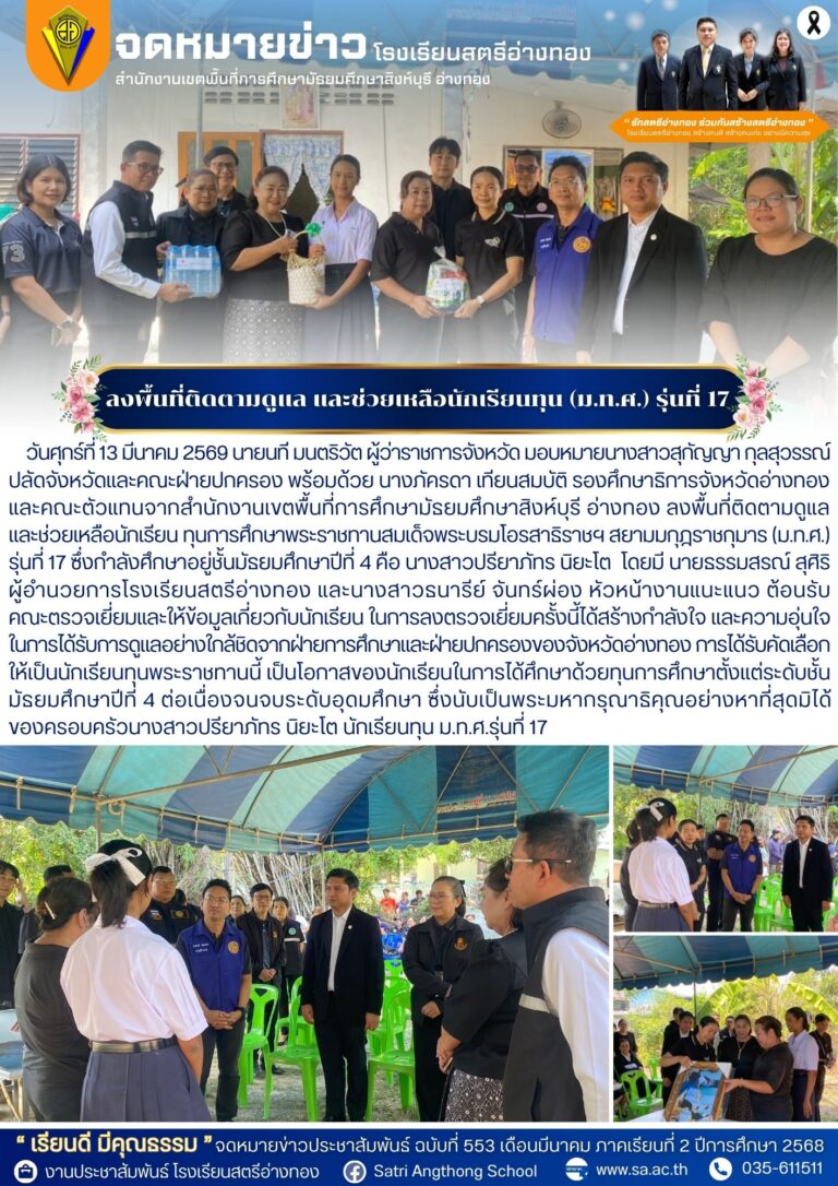 ลงพื้นที่ติดตามดูแล และช่วยเหลือนักเรียนทุน (ม.ท.ศ.) รุ่นที่ 1714 มีนาคม 2026โดยโรงเรียนสตรีอ่างทองวันที่14 มีนาคม 2026Read more→