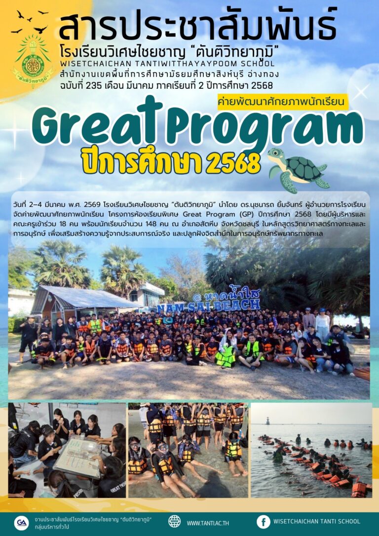 ว.ศ. จัดค่ายพัฒนาศักยภาพนักเรียน โครงการห้องเรียนพิเศษ Great Program (GP)5 มีนาคม 2026โดยโรงเรียนวิเศษไชยชาญ "ตันติวิทยาภูมิ"วันที่5 มีนาคม 2026Read more→