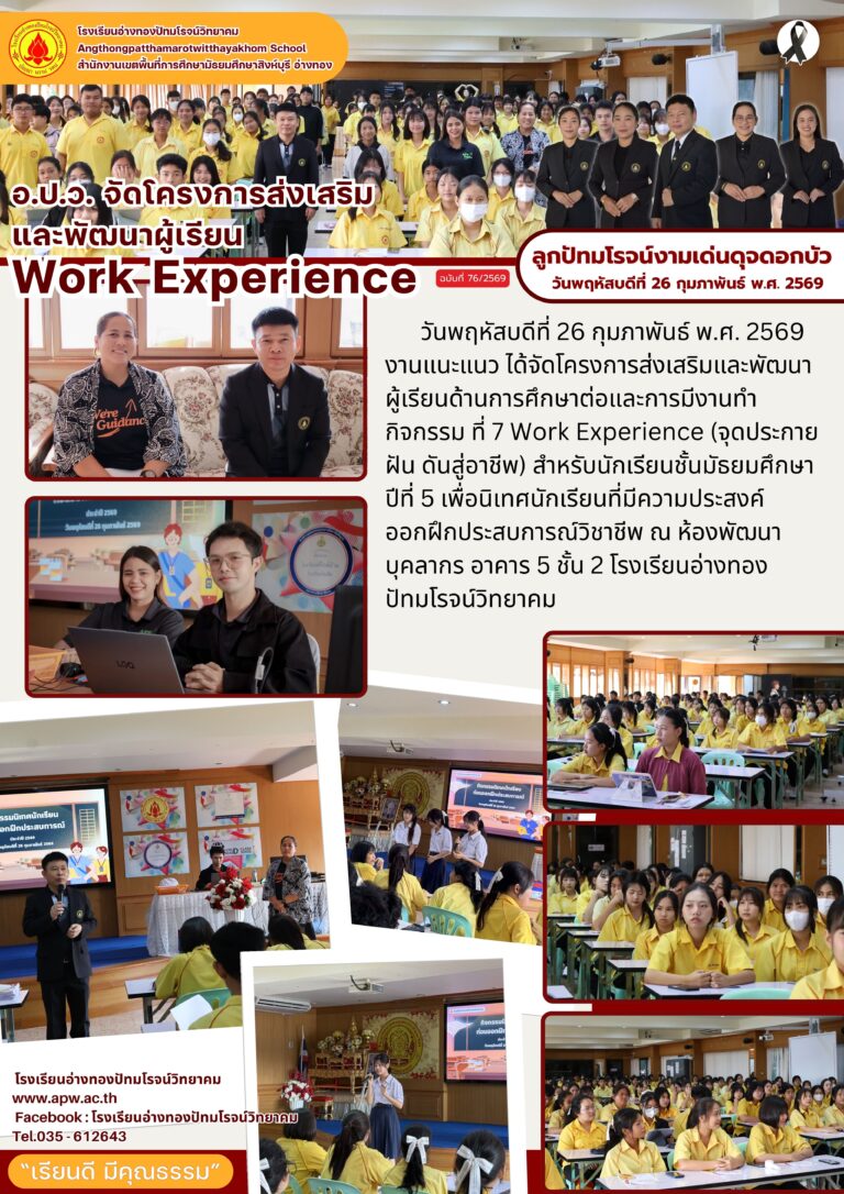 อ.ป.ว. จัดโครงการส่งเสริม และพัฒนาผู้เรียน Work Experience2 มีนาคม 2026โดยโรงเรียนอ่างทองปัทมโรจน์วิทยาคมวันที่2 มีนาคม 2026Read more→