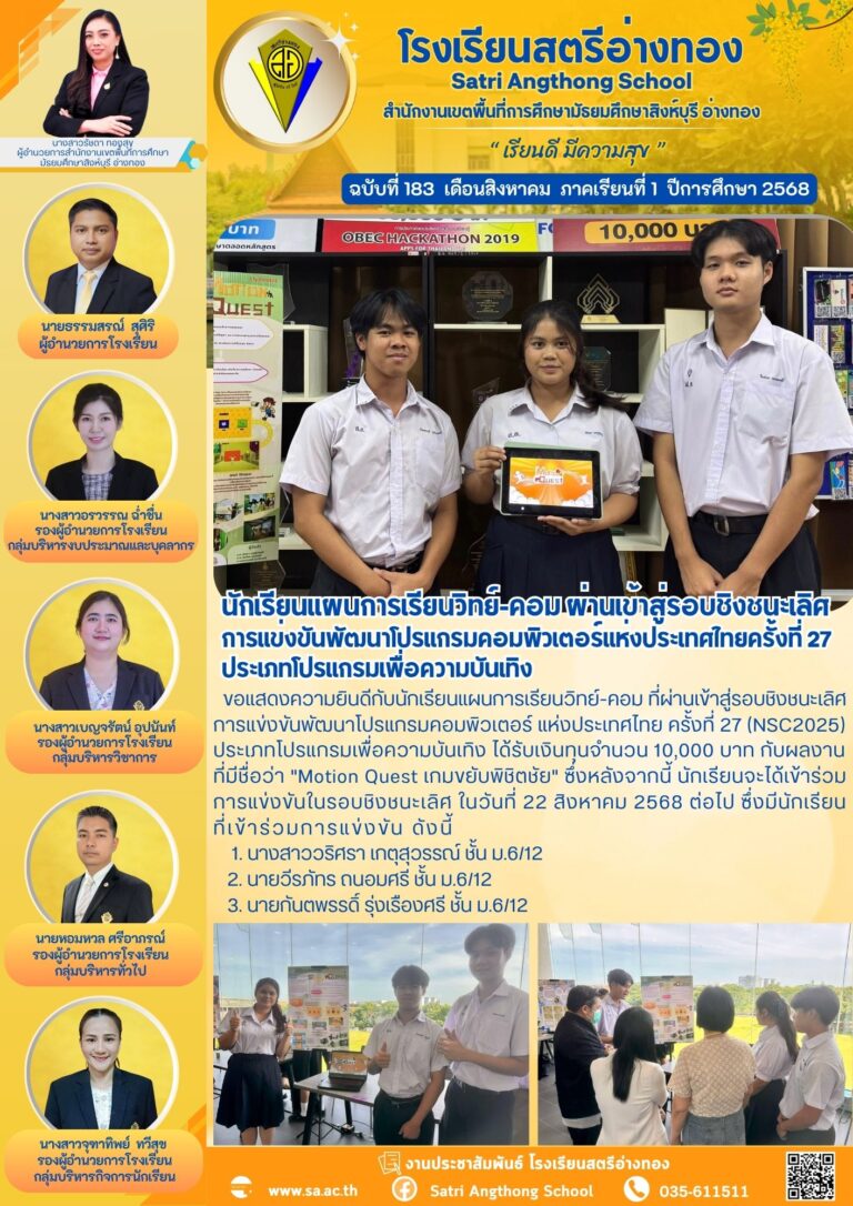 นักเรียนแผนการเรียนวิทย์-คอม ผ่านเข้าสู่รอบชิงชนะเลิศ การแข่งขันพัฒนาโปรแกรมคอมพิวเตอร์แห่งประเทศไทยครั้งที่ 27 ประเภทโปรแกรมเพื่อความบันเทิง13 สิงหาคม 2025โดยโรงเรียนสตรีอ่างทองวันที่13 สิงหาคม 2025Read more→