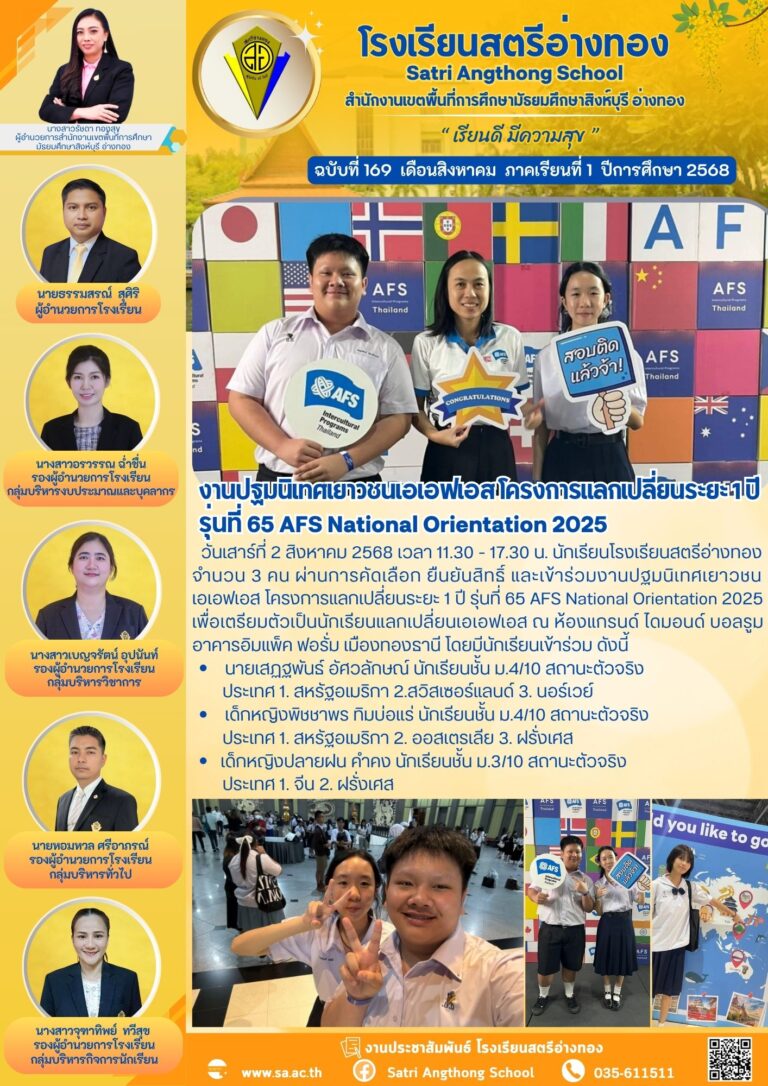 งานปฐมนิเทศเยาวชนเอเอฟเอส โครงการแลกเปลี่ยนระยะ 1 ปี รุ่นที่ 65 AFS National Orientation 20257 สิงหาคม 2025โดยโรงเรียนสตรีอ่างทองวันที่7 สิงหาคม 2025Read more→