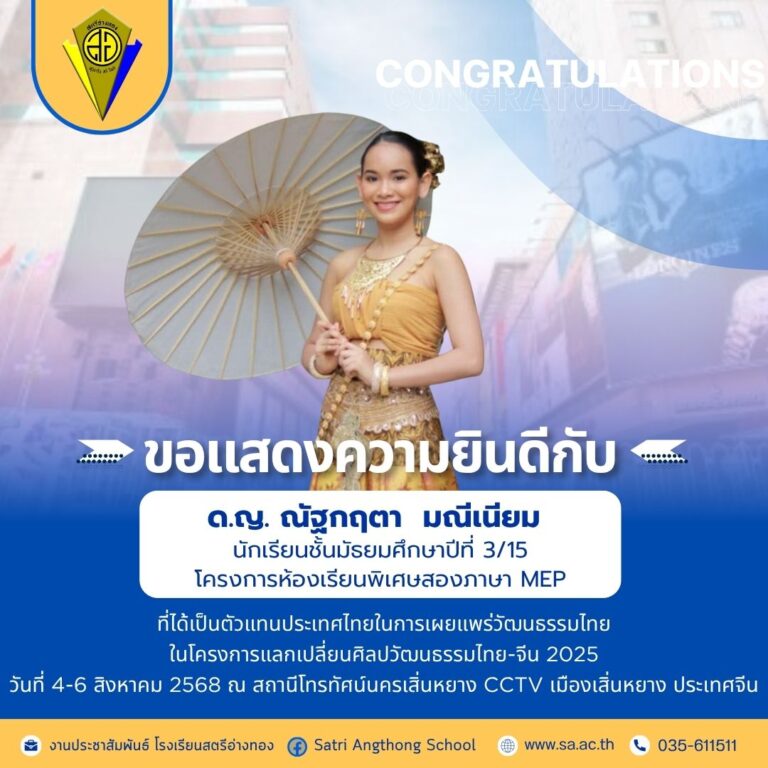 ขอแสดงความยินดีกับด.ญ. ณัฐกฤตา มณีเนียม นักเรียนโรงเรียนสตรีอ่างทอง6 สิงหาคม 2025โดยโรงเรียนสตรีอ่างทองวันที่6 สิงหาคม 2025Read more→