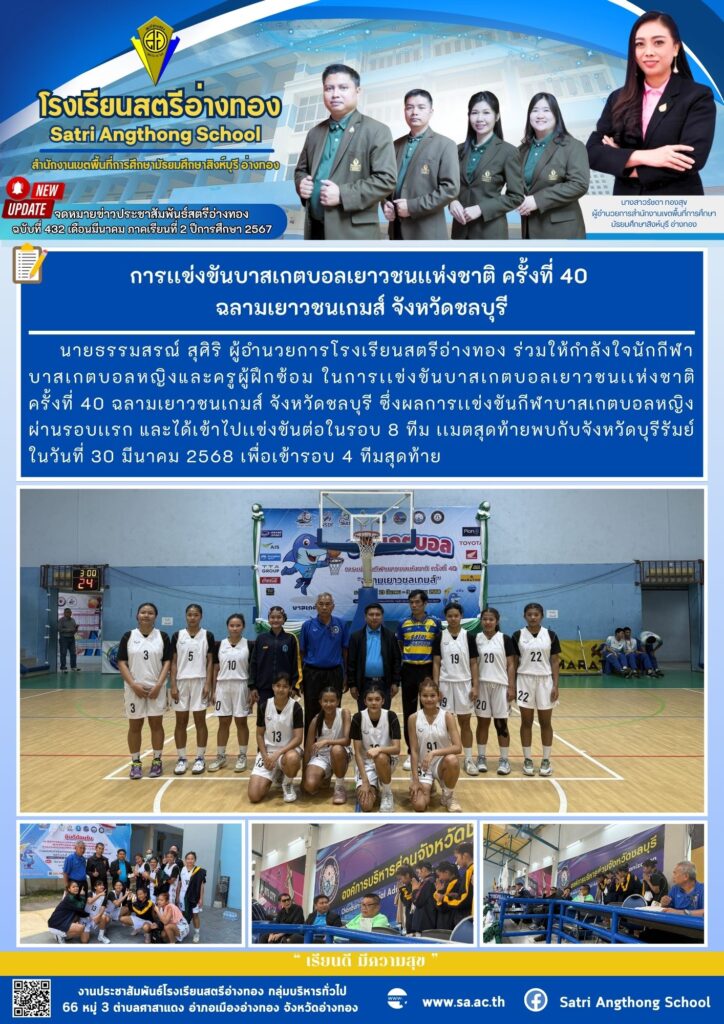 สตรีอ่างทองเข้าร่วมการเเข่งขันบาสเกตบอลเยาวชนเเห่งชาติ ครั้งที่ 40 ฉลามเยาวชนเกมส์ จังหวัดชลบุรี23 พฤษภาคม 202523 พฤษภาคม 2025โดยประชาสัมพันธ์วันที่23 พฤษภาคม 202523 พฤษภาคม 2025Read more→