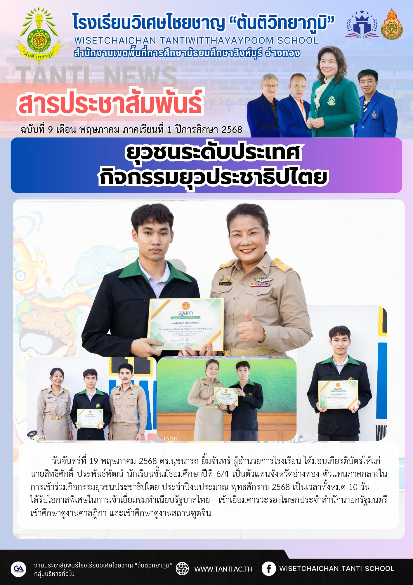 ว.ศ. เป็นตัวแทนจังหวัดอ่างทอง ตัวแทนภาคกลางในการเข้าร่วมกิจกรรมยุวชนประชาธิปไตย วันจันทร์ที่ 19 พฤษภาคม 2568 ดร.นุชนารถ ยิ้มจันทร์ ผู้อำนวยการโรงเรียน ได้มอบเกียรติบัตรให้แก่ นายสิทธิศักดิ์ ประพันธ์พัฒน์ นักเรียนชั้นมัธยมศึกษาปีที่ 6/4 เป็นตัวแทนจังหวัดอ่างทอง ตัวแทนภาคกลางในการเข้าร่วมกิจกรรมยุวชนประชาธิปไตย ประจำปีงบประมาณ พุทธศักราช 2568 เป็นเวลาทั้งหมด 10 วัน ได้รับโอกาสพิเศษในการเข้าเยี่ยมชมทำเนียบรัฐบาลไทย เข้าเยี่ยมคารวะรองโฆษกประจำสำนักนายกรัฐมนตรี เข้าศึกษาดูงานศาลฎีกา และเข้าศึกษาดูงานสถานฑูตจีน