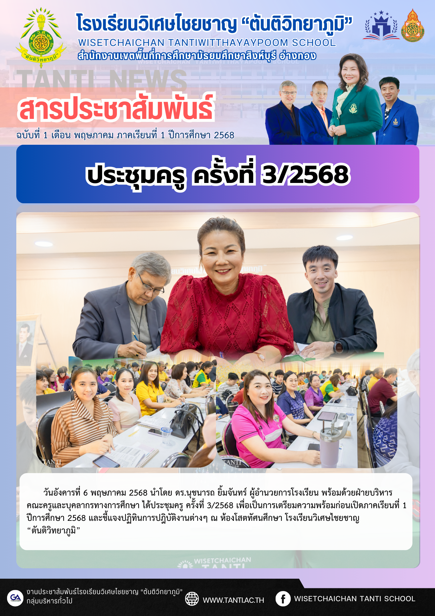 ว.ศ. ประชุมครูก่อนเปิดภาคเรียนที่ 1/2568 วันอังคารที่ 6 พฤษภาคม 2568 นำโดย ดร.นุชนารถ ยิ้มจันทร์ ผู้อำนวยการโรงเรียน พร้อมด้วยฝ่ายบริหาร คณะครูและบุคลากรทางการศึกษา ได้ประชุมครู ครั้งที่ 3/2568 เพื่อเป็นการเตรียมความพร้อมก่อนเปิดภาคเรียนที่ 1 ปีการศึกษา 2568 และชี้แจงปฏิทินการปฎิบัติงานต่างๆ ณ ห้องโสตทัศนศึกษา โรงเรียนวิเศษไชยชาญ “ตันติวิทยาภูมิ”