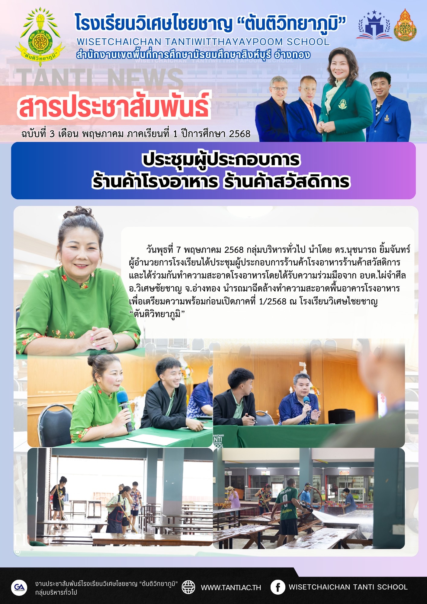 ว.ศ. ประชุมผู้ประกอบการร้านค้าและทำความสะอาดโรงอาหาร วันพุธที่ 7 พฤษภาคม 2568 กลุ่มบริหารทั่วไป นำโดย ดร.นุชนารถ ยิ้มจันทร์ ผู้อำนวยการโรงเรียนได้ประชุมผู้ประกอบการร้านค้าโรงอาหาร ร้านค้าสวัสดิการ และได้ร่วมกันทำความสะอาดโรงอาหารโดยได้รับความร่วมมือจาก อบต.ไผ่จำศีล อ.วิเศษชัยชาญ จ.อ่างทอง นำรถมาฉีดล้างทำความสะอาดพื้นอาคารโรงอาหารเพื่อเตรียมความพร้อมก่อนเปิดภาคที่ 1/2568 ณ โรงเรียนวิเศษไชยชาญ “ตันติวิทยาภูมิ”