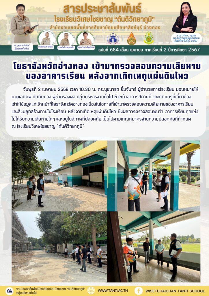 ว.ศ. ให้ข้อมูลแก่เจ้าหน้าที่โยธาจังหวัดอ่างทองวันพุธที่ 2 เมษายน 2568 เวลา 10.30 น. ดร.นุชนารถ ยิ้มจันทร์ ผู้อำนวยการโรงเรียน มอบหมายให้นายเอกภพ ทับทิมทอง ผู้ช่วยรองผอ.กลุ่มบริหารงานทั่วไป หัวหน้าอาคารสถานที่ และคณะครูที่เกี่ยวข้อง เข้าให้ข้อมูลแก่เจ้าหน้าที่โยธาจังหวัดอ่างทองเนื่องในโอกาสที่เข้ามาตรวจสอบความเสียหายของอาคารเรียนและสิ่งปลูกสร้างภายในโรงเรียน หลังจากเกิดเหตุแผ่นดินไหว ซึ่งผลการตรวจสอบพบว่า อาคารเรียนทุกแห่งไม่ได้รับความเสียหายใดๆ และอยู่ในสภาพที่ปลอดภัย เป็นไปตามเกณฑ์มาตรฐานความปลอดภัยที่กำหนดณ โรงเรียนวิเศษไชยชาญ “ตันติวิทยาภูมิ”