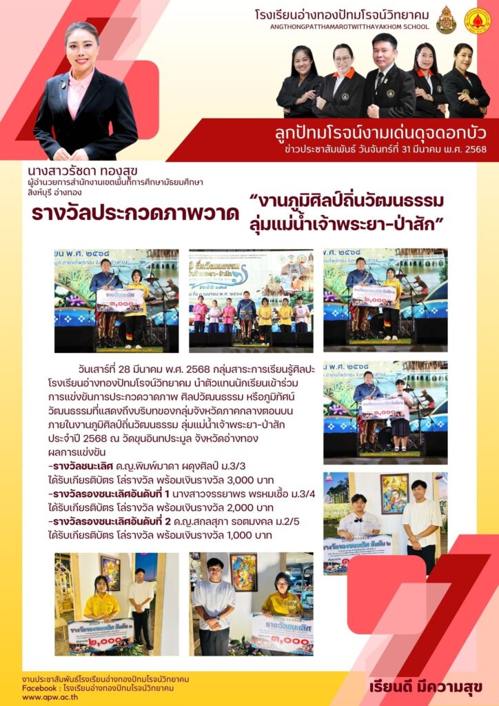 อ.ป.ว. รับรางวัลประกวดภาพวาด “งานภูมิศิลป์ถิ่นวัฒนธรรม ลุ่มแม่น้ำเจ้าพระยา-ป่าสัก”วันเสาร์ที่ 28 มีนาคม พ.ศ. 2568 กลุ่มสาระการเรียนรู้ศิลปะ โรงเรียนอ่างทองปัทมโรจน์วิทยาคม นำตัวแทนนักเรียนเข้าร่วมการแข่งขันการประกวดวาดภาพ ศิลปวัฒนธรรม หรือภูมิทัศน์วัฒนธรรมที่แสดงถึงบริบทของกลุ่มจังหวัดภาคกลางตอนบน ภายในงานภูมิศิลป์ถิ่นวัฒนธรรม ลุ่มแม่น้ำเจ้าพระยา-ป่าสัก ประจำปี 2568 ณ วัดขุนอินทประมูล จังหวัดอ่างทอง
