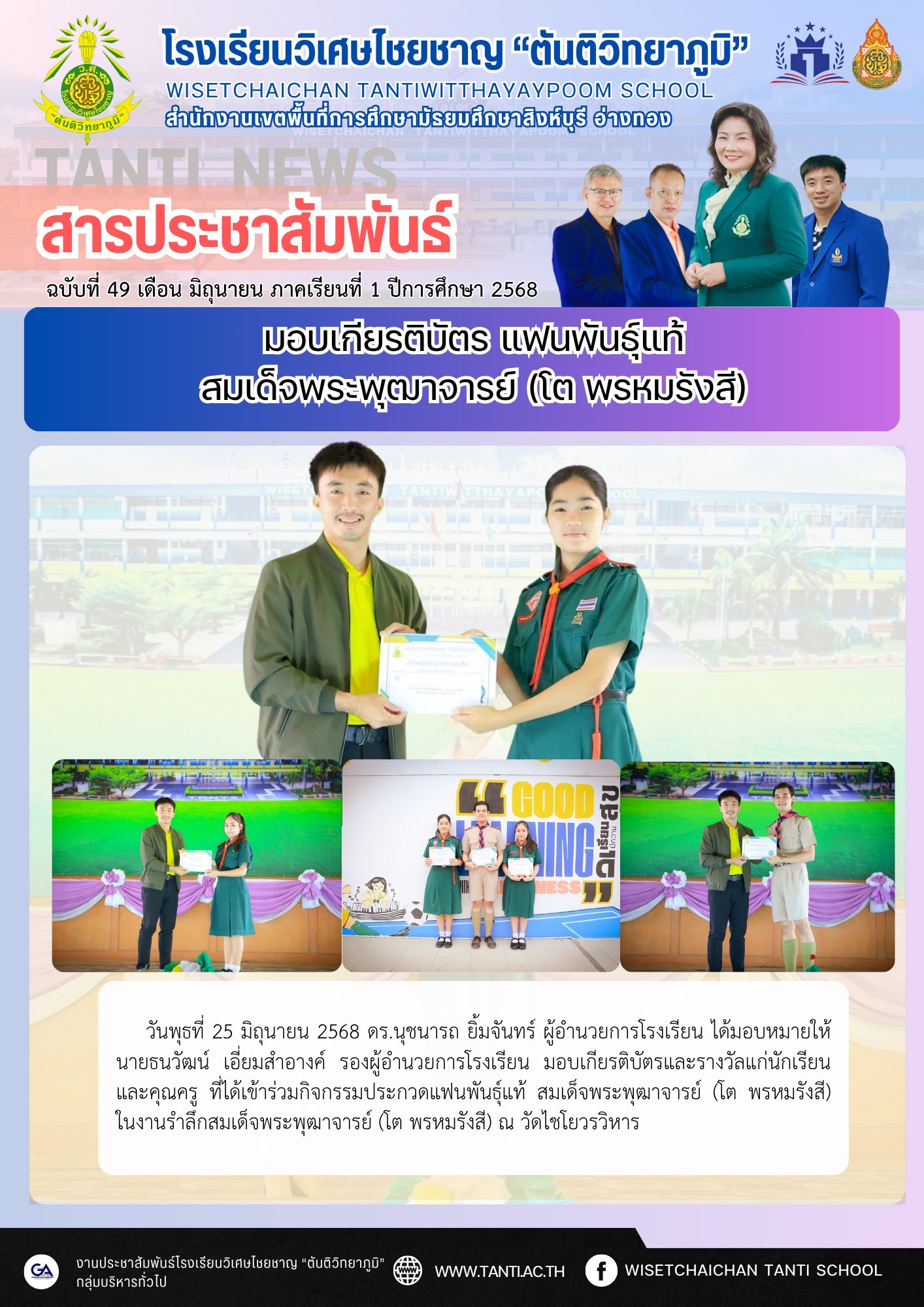 ว.ศ. ร่วมกิจกรรมประกวดแฟนพันธุ์แท้ สมเด็จพระพุฒาจารย์ วันพุธที่ 25 มิถุนายน 2568 ดร.นุชนารถ ยิ้มจันทร์ ผู้อำนวยการโรงเรียน ได้มอบหมายให้ นายธนวัฒน์ เอี่ยมสำอางค์ รองผู้อำนวยการโรงเรียน มอบเกียรติบัตรและรางวัลแก่นักเรียนและคุณครู ที่ได้เข้าร่วมกิจกรรมประกวดแฟนพันธุ์แท้ สมเด็จพระพุฒาจารย์ (โต พรหมรังสี) ในงานรำลึกสมเด็จพระพุฒาจารย์ (โต พรหมรังสี) ณ วัดไชโยวรวิหาร