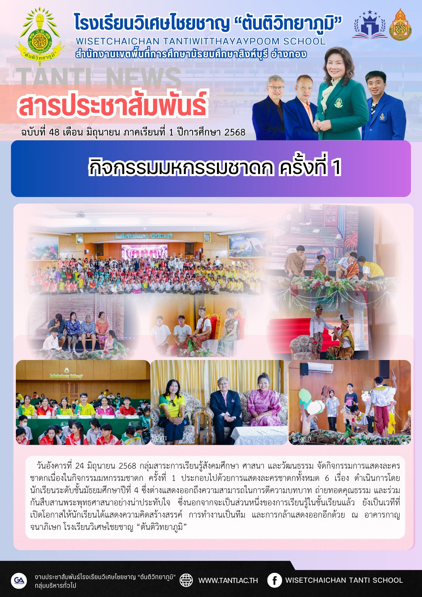 ว.ศ. จัดกิจกรรมการแสดงละครชาดก วันอังคารที่ 24 มิถุนายน 2568 กลุ่มสาระการเรียนรู้สังคมศึกษา ศาสนา และวัฒนธรรม จัดกิจกรรมการแสดงละครชาดกเนื่องในกิจกรรมมหกรรมชาดก ครั้งที่ 1 ประกอบไปด้วยการแสดงละครชาดกทั้งหมด 6 เรื่อง ดำเนินการโดยนักเรียนระดับชั้นมัธยมศึกษาปีที่ 4 ซึ่งต่างแสดงออกถึงความสามารถในการตีความบทบาท ถ่ายทอดคุณธรรม และร่วมกันสืบสานพระพุทธศาสนาอย่างน่าประทับใจ ซึ่งนอกจากจะเป็นส่วนหนึ่งของการเรียนรู้ในชั้นเรียนแล้ว ยังเป็นเวทีที่เปิดโอกาสให้นักเรียนได้แสดงความคิดสร้างสรรค์ การทำงานเป็นทีม และการกล้าแสดงออกอีกด้วย ณ อาคารกาญจนาภิเษก โรงเรียนวิเศษไชยชาญ “ตันติวิทยาภูมิ”