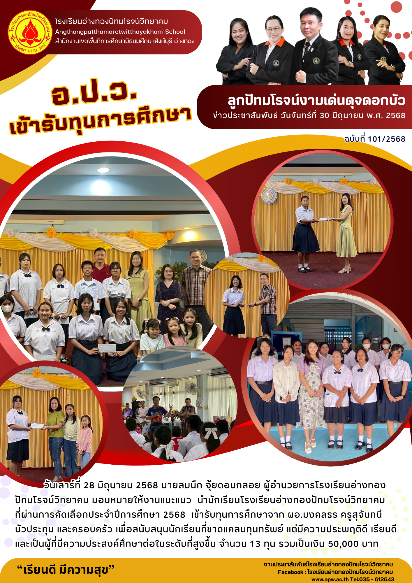 วันเสาร์ที่ 28 มิถุนายน 2568 นายสมนึก จุ้ยดอนกลอย ผู้อำนวยการโรงเรียนอ่างทองปัทมโรจน์วิทยาคม มอบหมายให้งานแนะแนว นำนักเรียนโรงเรียนอ่างทองปัทมโรจน์วิทยาคมที่ผ่านการคัดเลือกประจำปีการศึกษา 2568 เข้ารับทุนการศึกษาจาก ผอ.มงคลธร ครูสุจันทนี บัวประทุม และครอบครัว เพื่อสนับสนุนนักเรียนที่ขาดแคลนทุนทรัพย์ แต่มีความประพฤติดี เรียนดี และเป็นผู้ที่มีความประสงค์ศึกษาต่อในระดับที่สูงขึ้น จำนวน 13 ทุน รวมเป็นเงิน 50,000 บาท