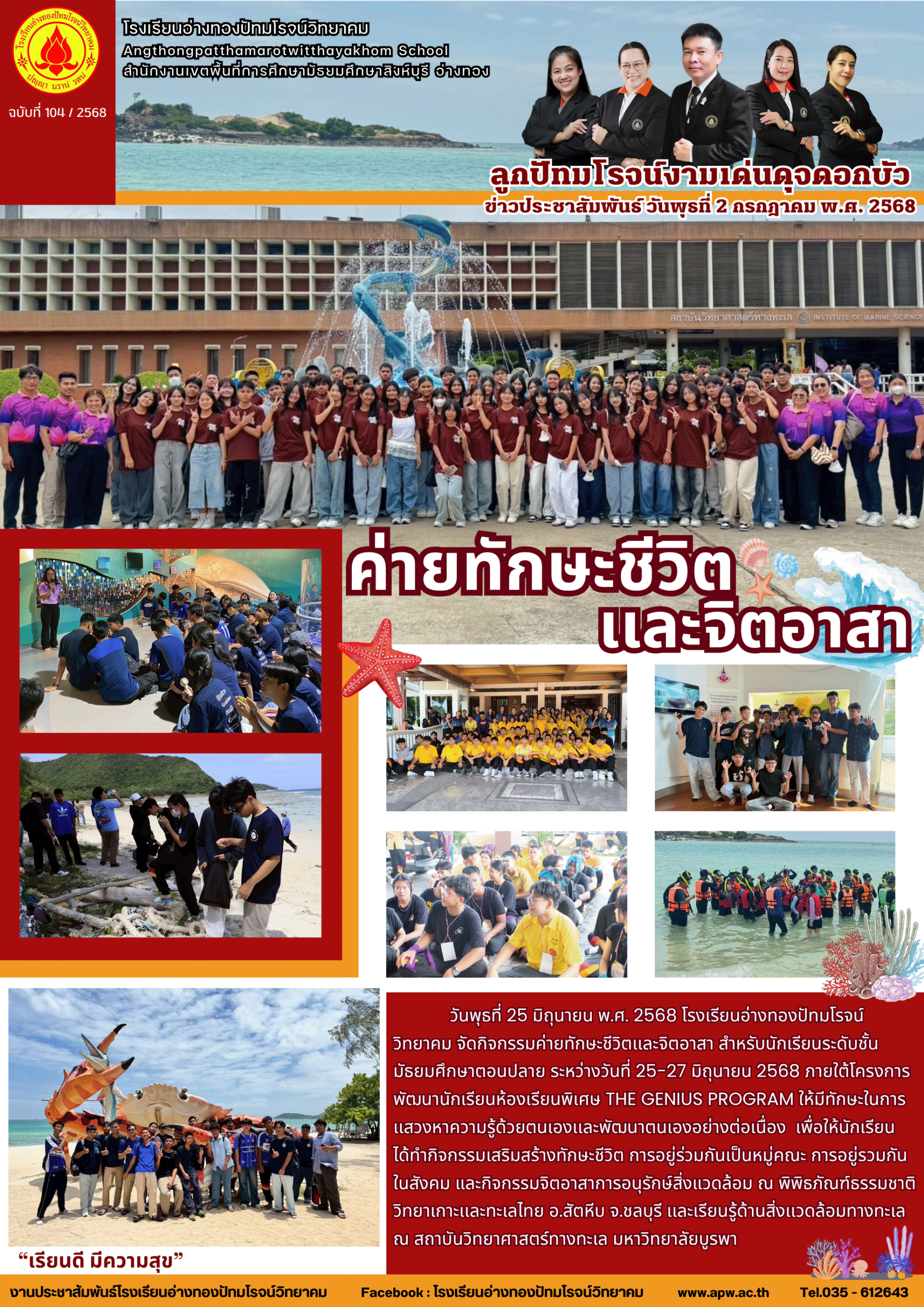 วันพุธที่ 25 มิถุนายน พ.ศ. 2568 โรงเรียนอ่างทองปัทมโรจน์วิทยาคม จัดกิจกรรมค่ายทักษะชีวิตเเละจิตอาสา สำหรับนักเรียนระดับชั้นมัธยมศึกษาตอนปลาย ระหว่างวันที่ 25-27 มิถุนายน 2568 ภายใต้โครงการพัฒนานักเรียนห้องเรียนพิเศษ The Genius Program ให้มีทักษะในการเเสวงหาความรู้ด้วยตนเองเเละพัฒนาตนเองอย่างต่อเนื่อง เพื่อให้นักเรียนได้ทำกิจกรรมเสริมสร้างทักษะชีวิต การอยู่ร่วมกันเป็นหมู่คณะ การอยู่รวมกันในสังคม และกิจกรรมจิตอาสาการอนุรักษ์สิ่งแวดล้อม ณ พิพิธภัณฑ์ธรรมชาติวิทยาเกาะเเละทะเลไทย อ.สัตหีบ จ.ชลบุรี เเละเรียนรู้ด้านสิ่งเเวดล้อมทางทะเล ณ สถาบันวิทยาศาสตร์ทางทะเล มหาวิทยาลัยบูรพา