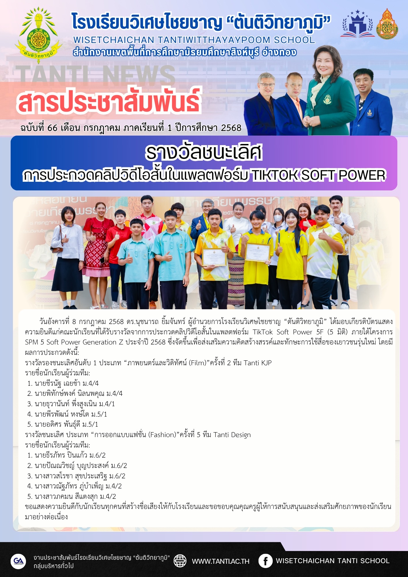วันอังคารที่ 8 กรกฎาคม 2568 ดร.นุชนารถ ยิ้มจันทร์ ผู้อำนวยการโรงเรียนวิเศษไชยชาญ “ตันติวิทยาภูมิ” ได้มอบเกียรติบัตรแสดงความยินดีแก่คณะนักเรียนที่ได้รับรางวัลจากการประกวดคลิปวิดีโอสั้นในแพลตฟอร์ม TikTok Soft Power 5F (5 มิติ) ภายใต้โครงการ SPM 5 Soft Power Generation Z ประจำปี 2568 ซึ่งจัดขึ้นเพื่อส่งเสริมความคิดสร้างสรรค์และทักษะการใช้สื่อของเยาวชนรุ่นใหม่ โดยมีผลการประกวดดังนี้: