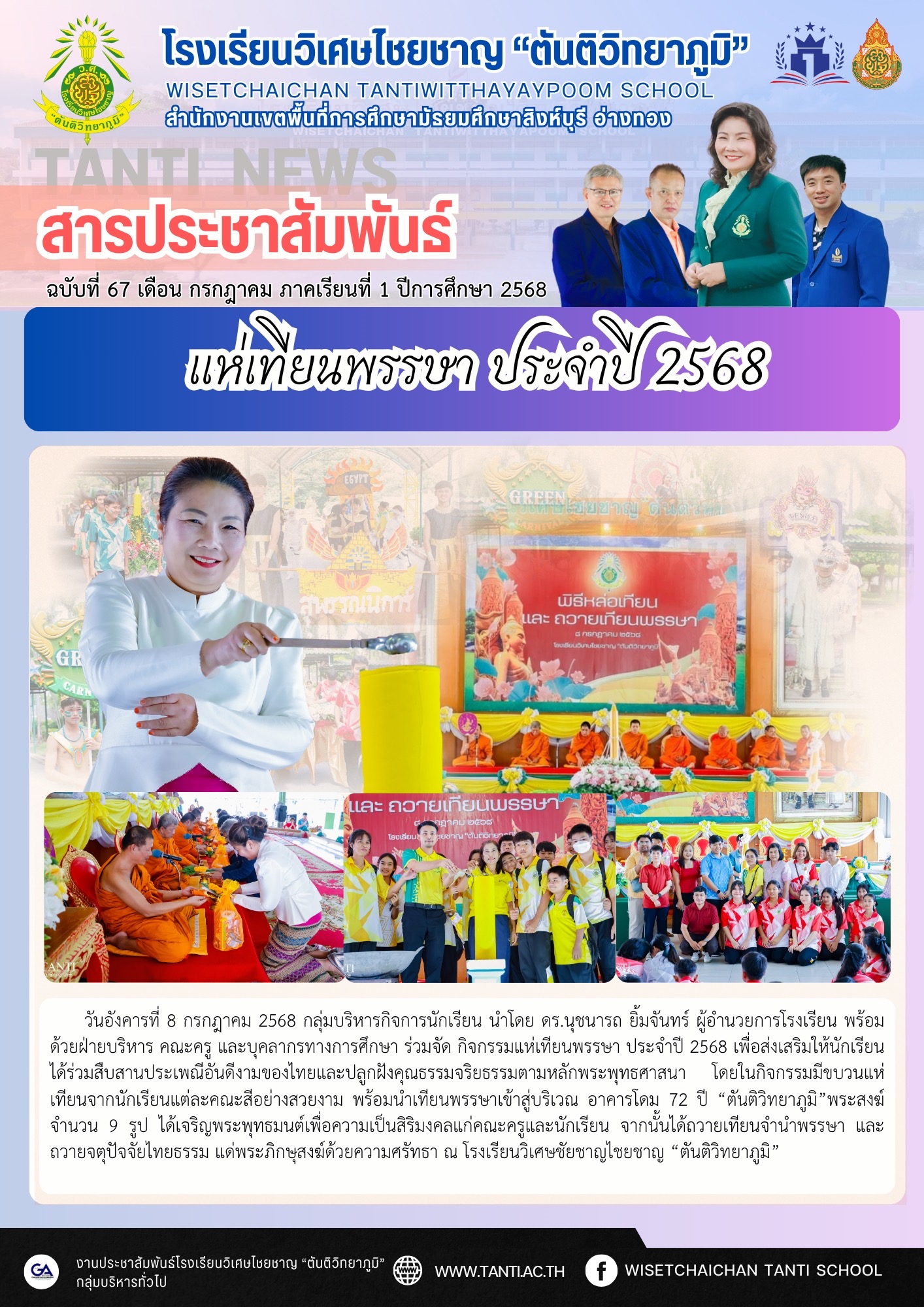 วันอังคารที่ 8 กรกฎาคม 2568 กลุ่มบริหารกิจการนักเรียน นำโดย ดร.นุชนารถ ยิ้มจันทร์ ผู้อำนวยการโรงเรียน พร้อมด้วยฝ่ายบริหาร คณะครู และบุคลากรทางการศึกษา ร่วมจัดกิจกรรมแห่เทียนพรรษา ประจำปี 2568 เพื่อส่งเสริมให้นักเรียนได้ร่วมสืบสานประเพณีอันดีงามของไทยและปลูกฝังคุณธรรมจริยธรรมตามหลักพระพุทธศาสนา โดยในกิจกรรมมีขบวนแห่เทียนจากนักเรียนแต่ละคณะสีอย่างสวยงาม พร้อมนำเทียนพรรษาเข้าสู่บริเวณ อาคารโดม 72 ปี “ตันติวิทยาภูมิ”พระสงฆ์จำนวน 9 รูป ได้เจริญพระพุทธมนต์เพื่อความเป็นสิริมงคลแก่คณะครูและนักเรียน จากนั้นได้ถวายเทียนจำนำพรรษา และ ถวายจตุปัจจัยไทยธรรม แด่พระภิกษุสงฆ์ด้วยความศรัทธา ณ โรงเรียนวิเศษชัยชาญไชยชาญ “ตันติวิทยาภูมิ”