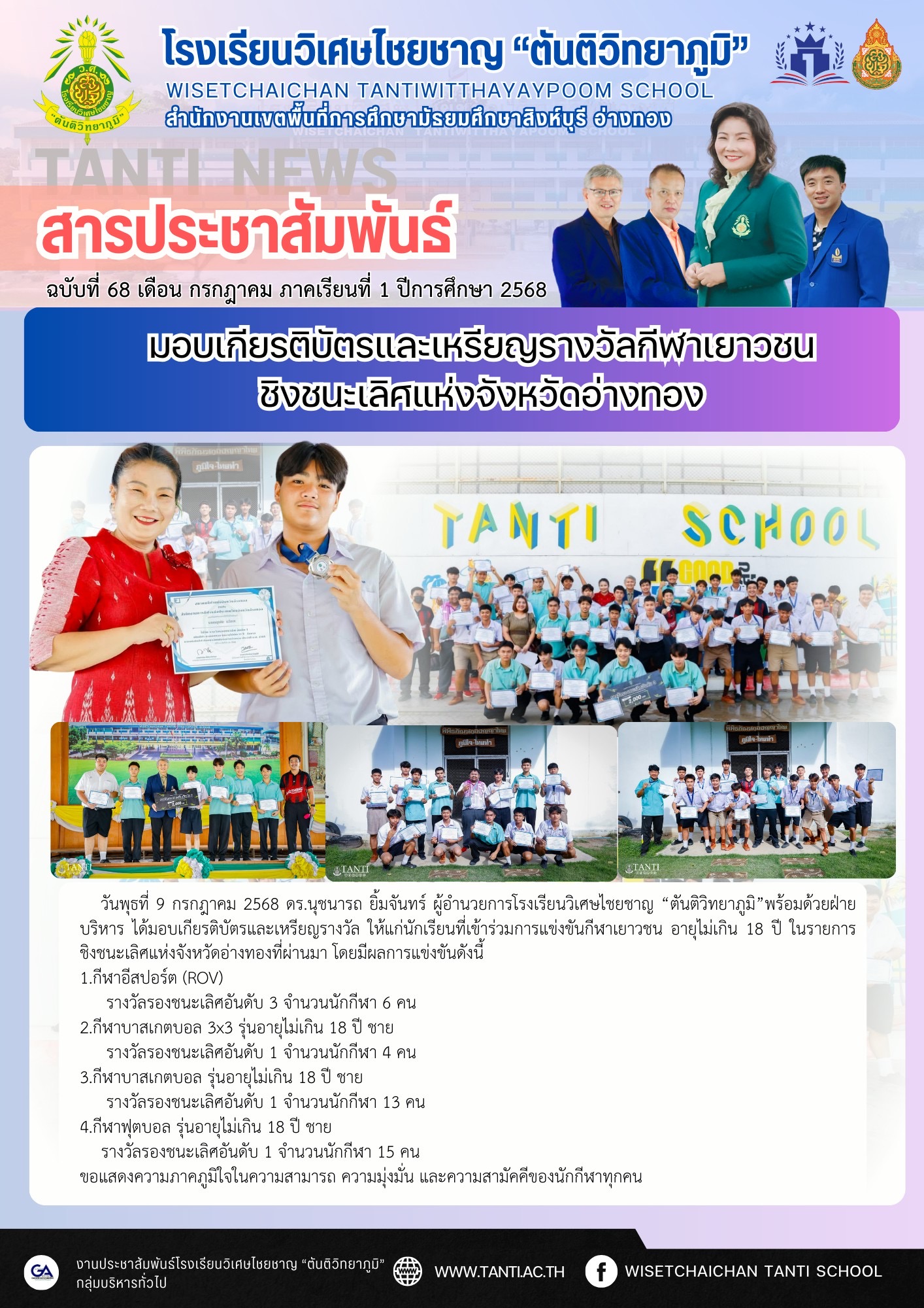 วันพุธที่ 9 กรกฎาคม 2568 ดร.นุชนารถ ยิ้มจันทร์ ผู้อำนวยการโรงเรียนวิเศษไชยชาญ “ตันติวิทยาภูมิ”พร้อมด้วยฝ่ายบริหาร ได้มอบเกียรติบัตรและเหรียญรางวัล ให้แก่นักเรียนที่เข้าร่วมการแข่งขันกีฬาเยาวชน อายุไม่เกิน 18 ปี ในรายการชิงชนะเลิศแห่งจังหวัดอ่างทองที่ผ่านมา โดยมีผลการแข่งขันดังนี้
