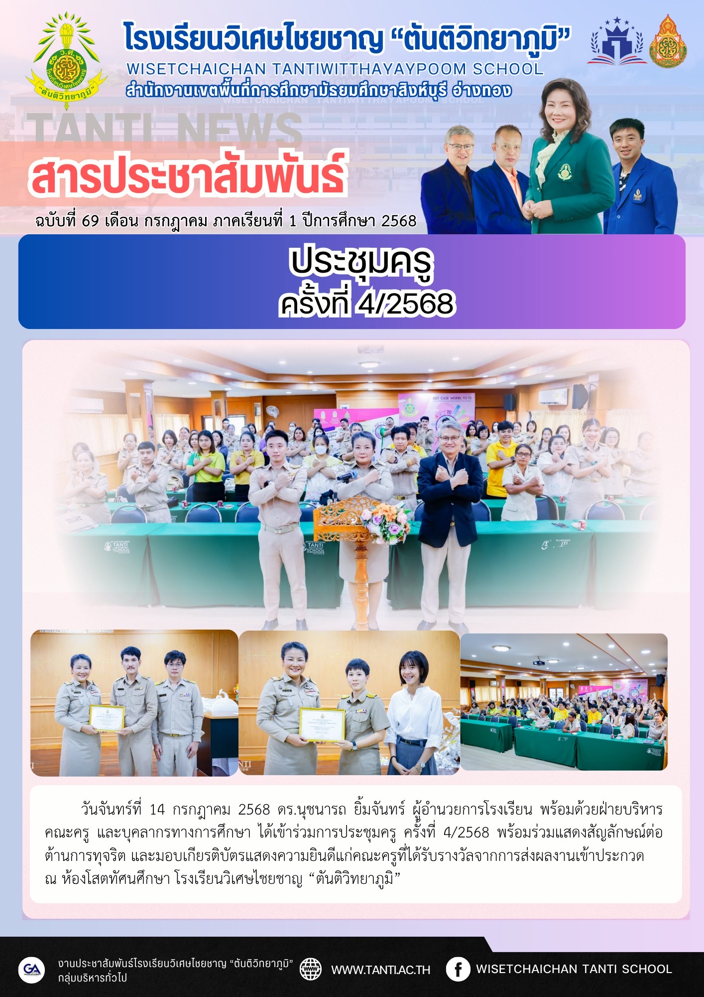 วันจันทร์ที่ 14 กรกฎาคม 2568 ดร.นุชนารถ ยิ้มจันทร์ ผู้อำนวยการโรงเรียน พร้อมด้วยฝ่ายบริหาร คณะครู และบุคลากรทางการศึกษา ได้เข้าร่วมการประชุมครู ครั้งที่ 4/2568 พร้อมร่วมแสดงสัญลักษณ์ต่อต้านการทุจริต และมอบเกียรติบัตรแสดงความยินดีแก่คณะครูที่ได้รับรางวัลจากการส่งผลงานเข้าประกวด ณ ห้องโสตทัศนศึกษา โรงเรียนวิเศษไชยชาญ “ตันติวิทยาภูมิ”