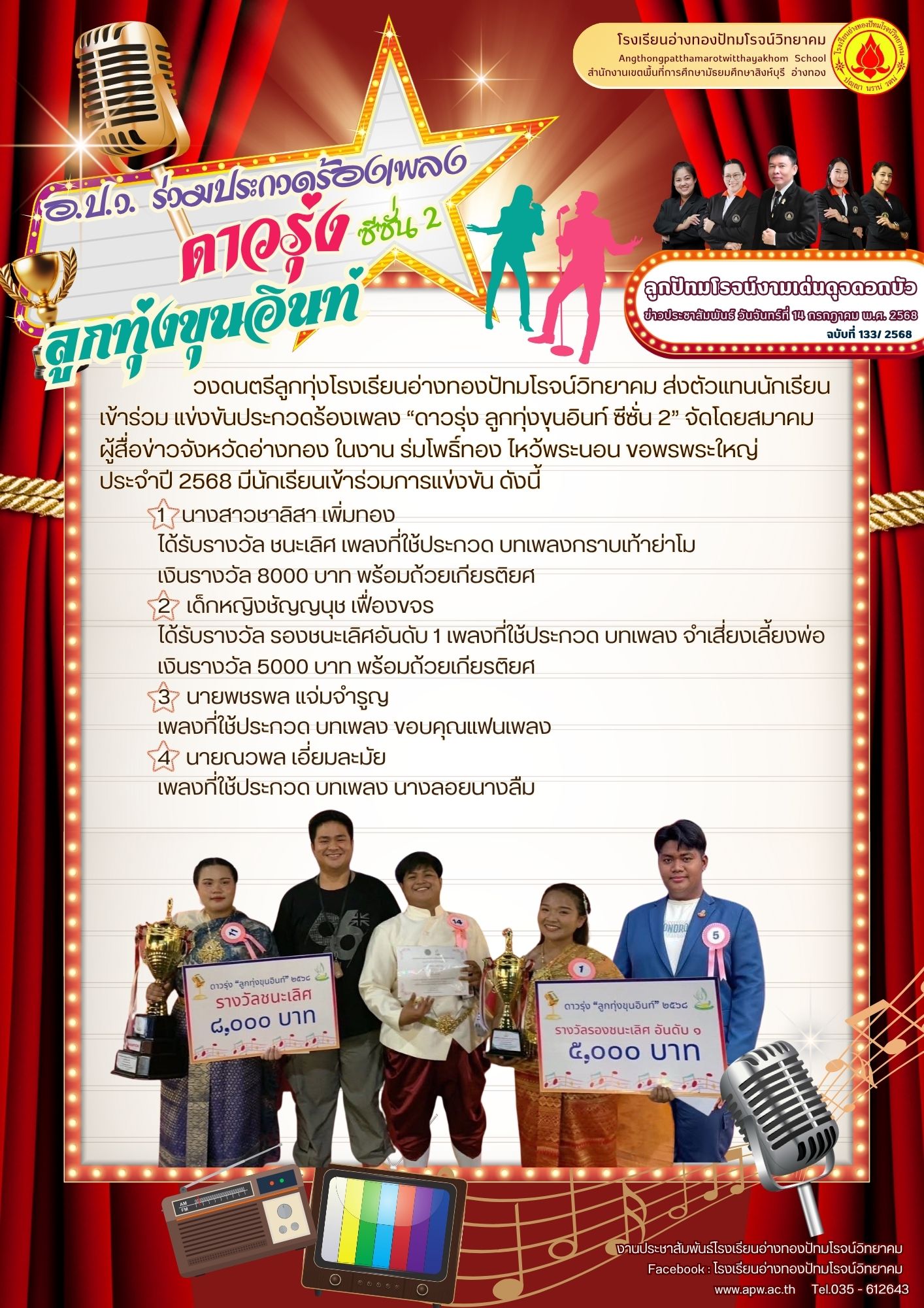 วงดนตรีลูกทุ่งโรงเรียนอ่างทองปัทมโรจน์วิทยาคม ส่งตัวแทนนักเรียนเข้าร่วม แข่งขันประกวดร้องเพลง “ดาวรุ่ง ลูกทุ่งขุนอินท์ ซีซั่น 2” จัดโดยสมาคมผู้สื่อข่าวจังหวัดอ่างทอง ในงาน ร่มโพธิ์ทอง ไหว้พระนอน ขอพรพระใหญ่ ประจำปี 2568 มีนักเรียนเข้าร่วมการแข่งขัน ดังนี้