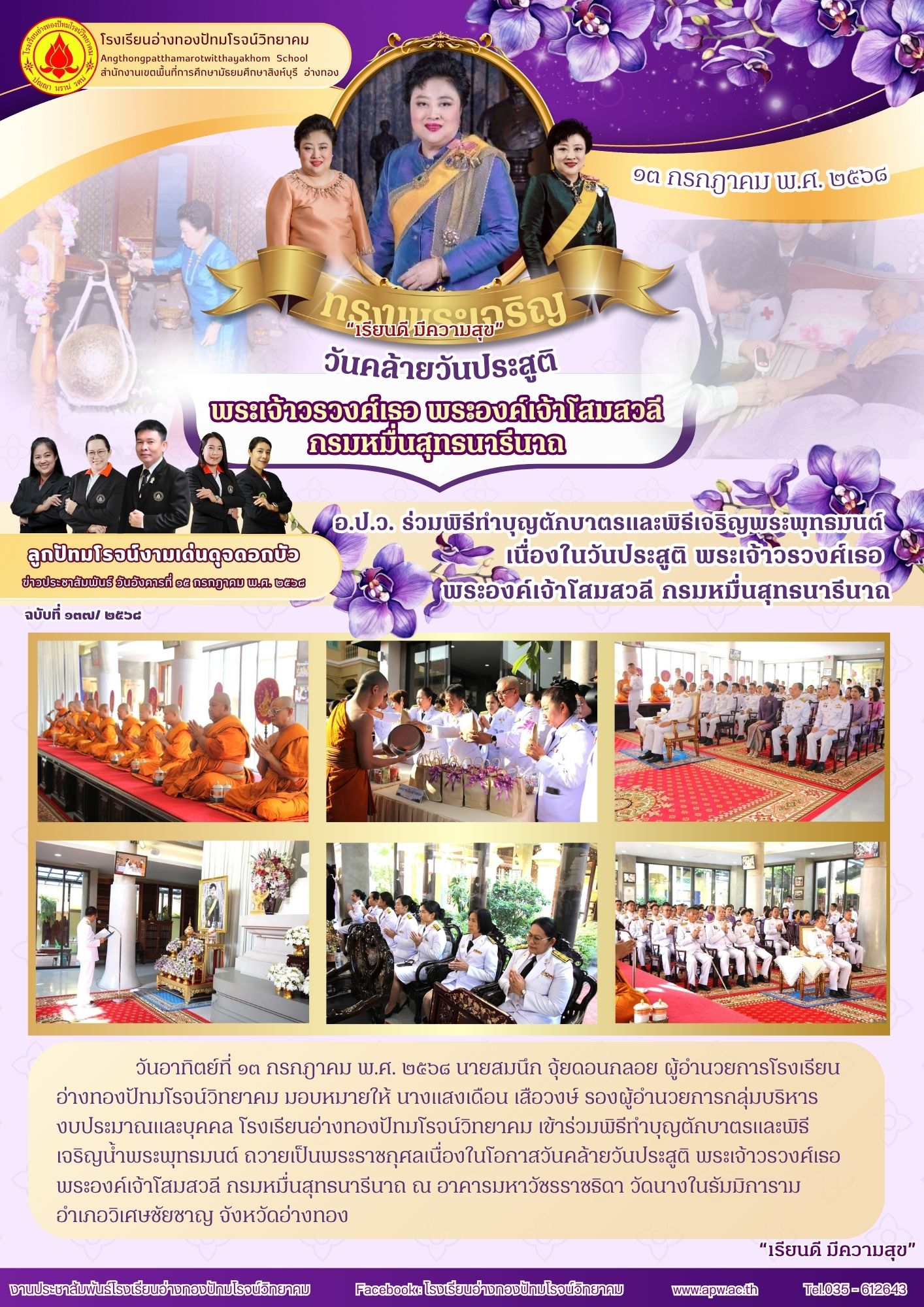 วันอาทิตย์ที่ ๑๓ กรกฎาคม พ.ศ. ๒๕๖๘ นายสมนึก จุ้ยดอนกลอย ผู้อำนวยการโรงเรียนอ่างทองปัทมโรจน์วิทยาคม มอบหมายให้ นางแสงเดือน เสือวงษ์ รองผู้อำนวยการกลุ่มบริหารงบประมาณและบุคคล โรงเรียนอ่างทองปัทมโรจน์วิทยาคม เข้าร่วมพิธีทำบุญตักบาตรและพิธีเจริญน้ำพระพุทธมนต์ ถวายเป็นพระราชกุศลเนื่องในโอกาสวันคล้ายวันประสูติ พระเจ้าวรวงศ์เธอพระองค์เจ้าโสมสวลี กรมหมื่นสุทธนารีนาถ ณ อาคารมหาวัชรราชธิดา วัดนางในธัมมิการาม อำเภอวิเศษชัยชาญ จังหวัดอ่างทอง