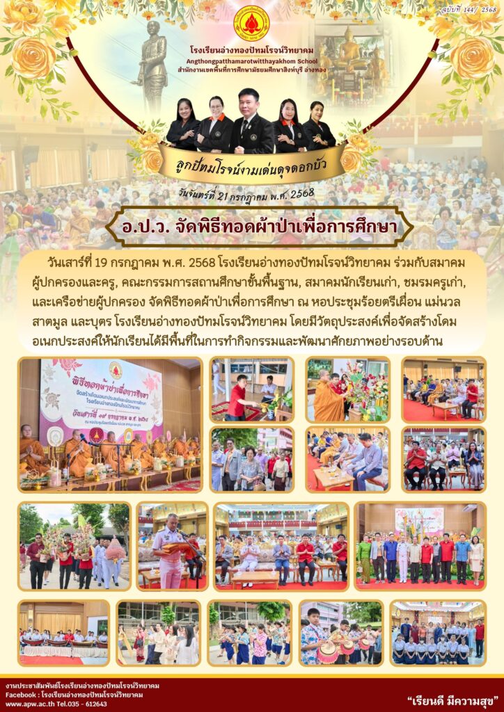 วันเสาร์ที่ 19 กรกฎาคม พ.ศ. 2568 โรงเรียนอ่างทองปัทมโรจน์วิทยาคม ร่วมกับสมาคมผู้ปกครองและครู, คณะกรรมการสถานศึกษาขั้นพื้นฐาน, สมาคมนักเรียนเก่า, ชมรมครูเก่า, และเครือข่ายผู้ปกครอง จัดพิธีทอดผ้าป่าเพื่อการศึกษา ณ หอประชุมร้อยตรีเผื่อน แม่นวล สาตมูล และบุตร โรงเรียนอ่างทองปัทมโรจน์วิทยาคม โดยมีวัตถุประสงค์เพื่อจัดสร้างโดมอเนกประสงค์ให้นักเรียนได้มีพื้นที่ในการทำกิจกรรมและพัฒนาศักยภาพอย่างรอบด้าน