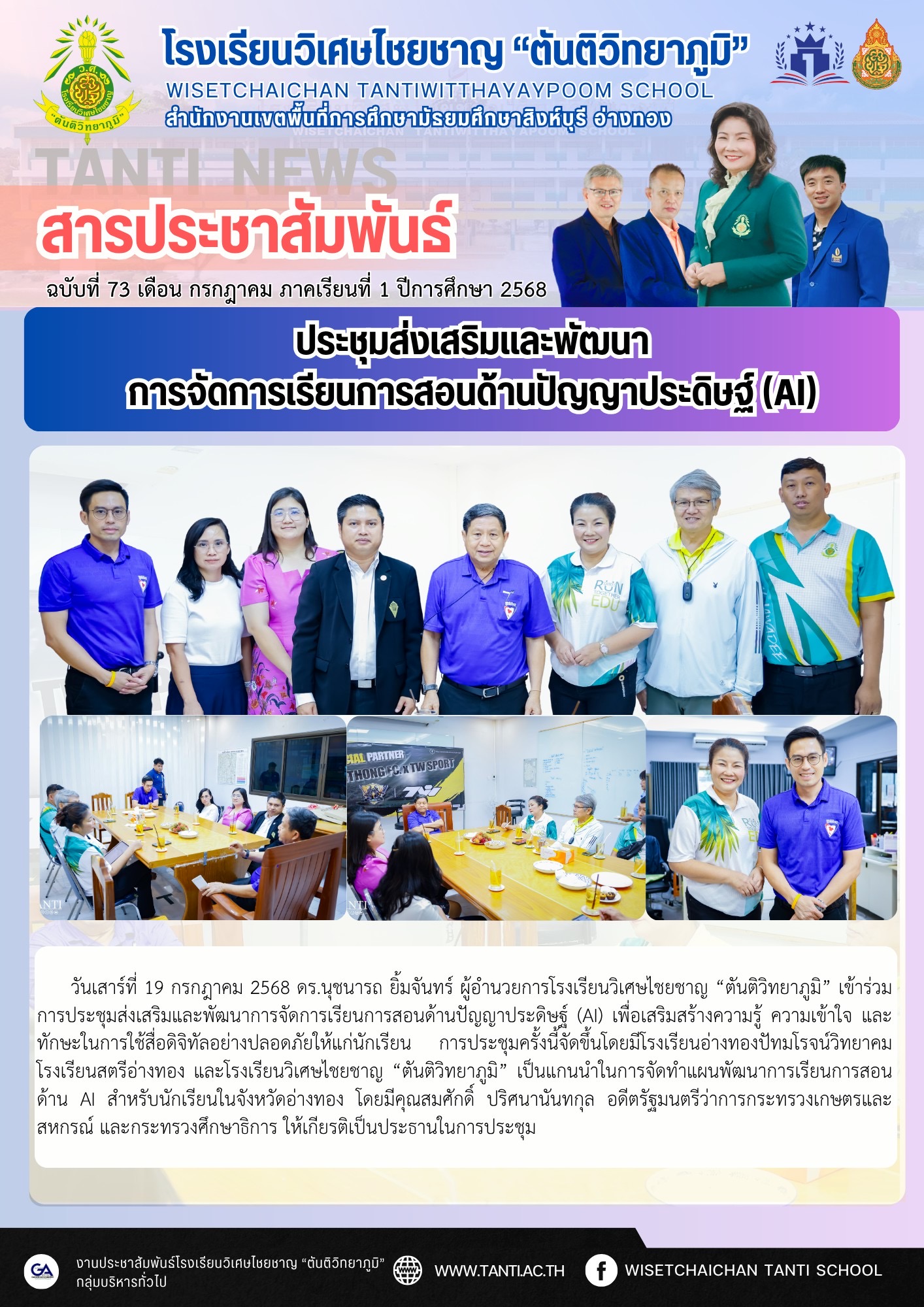 วันเสาร์ที่ 19 กรกฎาคม 2568 ดร.นุชนารถ ยิ้มจันทร์ ผู้อำนวยการโรงเรียนวิเศษไชยชาญ “ตันติวิทยาภูมิ” เข้าร่วมการประชุมส่งเสริมและพัฒนาการจัดการเรียนการสอนด้านปัญญาประดิษฐ์ (AI) เพื่อเสริมสร้างความรู้ ความเข้าใจ และทักษะในการใช้สื่อดิจิทัลอย่างปลอดภัยให้แก่นักเรียน การประชุมครั้งนี้จัดขึ้นโดยมีโรงเรียนอ่างทองปัทมโรจน์วิทยาคม โรงเรียนสตรีอ่างทอง และโรงเรียนวิเศษไชยชาญ “ตันติวิทยาภูมิ” เป็นแกนนำในการจัดทำแผนพัฒนาการเรียนการสอนด้าน AI สำหรับนักเรียนในจังหวัดอ่างทอง โดยมีคุณสมศักดิ์ ปริศนานันทกุล อดีตรัฐมนตรีว่าการกระทรวงเกษตรและสหกรณ์ และกระทรวงศึกษาธิการ ให้เกียรติเป็นประธานในการประชุม