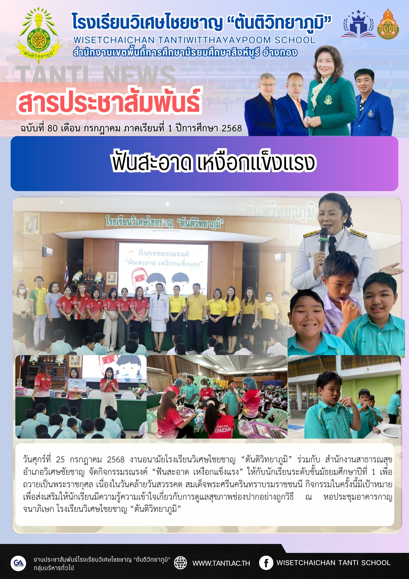 วันศุกร์ที่ 25 กรกฎาคม 2568 งานอนามัยโรงเรียนวิเศษไชยชาญ “ตันติวิทยาภูมิ” ร่วมกับ สำนักงานสาธารณสุขอำเภอวิเศษชัยชาญ จัดกิจกรรมรณรงค์ “ฟันสะอาด เหงือกแข็งแรง” ให้กับนักเรียนระดับชั้นมัธยมศึกษาปีที่ 1 เพื่อถวายเป็นพระราชกุศล เนื่องในวันคล้ายวันสวรรคต สมเด็จพระศรีนครินทราบรมราชชนนี กิจกรรมในครั้งนี้มีเป้าหมายเพื่อส่งเสริมให้นักเรียนมีความรู้ความเข้าใจเกี่ยวกับการดูแลสุขภาพช่องปากอย่างถูกวิธี ณ หอประชุมอาคารกาญจนาภิเษก โรงเรียนวิเศษไชยชาญ “ตันติวิทยาภูมิ”