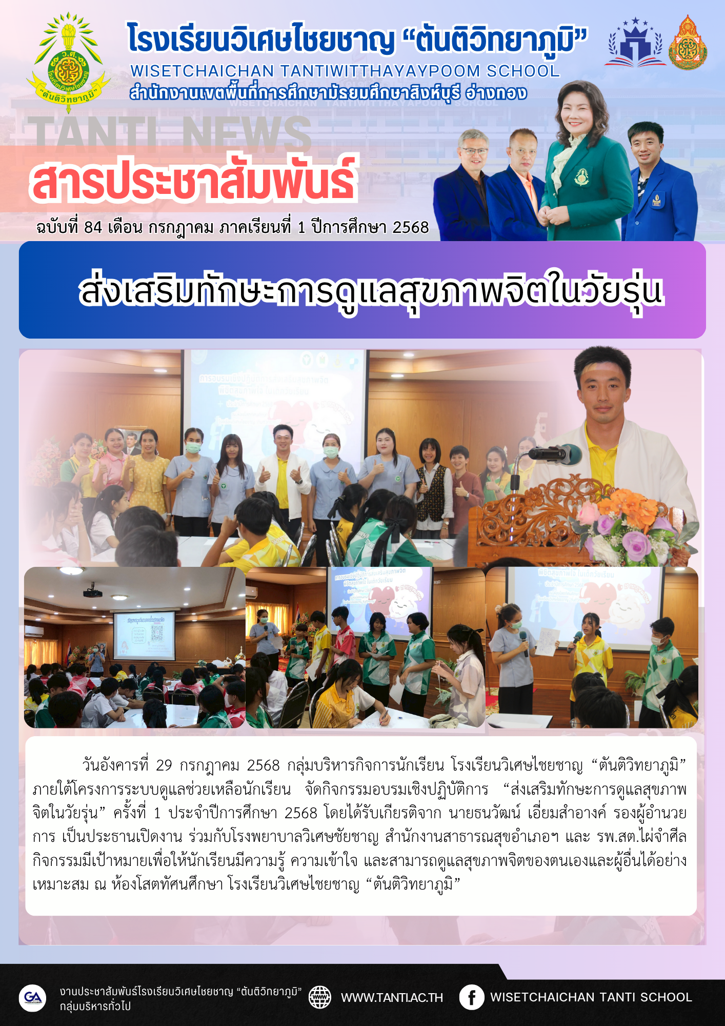 วันอังคารที่ 29 กรกฎาคม 2568 กลุ่มบริหารกิจการนักเรียน โรงเรียนวิเศษไชยชาญ “ตันติวิทยาภูมิ” ภายใต้โครงการระบบดูแลช่วยเหลือนักเรียน จัดกิจกรรมอบรมเชิงปฏิบัติการ “ส่งเสริมทักษะการดูแลสุขภาพจิตในวัยรุ่น” ครั้งที่ 1 ประจำปีการศึกษา 2568 โดยได้รับเกียรติจาก นายธนวัฒน์ เอี่ยมสำอางค์ รองผู้อำนวยการ เป็นประธานเปิดงาน ร่วมกับโรงพยาบาลวิเศษชัยชาญ สำนักงานสาธารณสุขอำเภอฯ และ รพ.สต.ไผ่จำศีล กิจกรรมมีเป้าหมายเพื่อให้นักเรียนมีความรู้ ความเข้าใจ และสามารถดูแลสุขภาพจิตของตนเองและผู้อื่นได้อย่างเหมาะสม ณ ห้องโสตทัศนศึกษา โรงเรียนวิเศษไชยชาญ “ตันติวิทยาภูมิ”