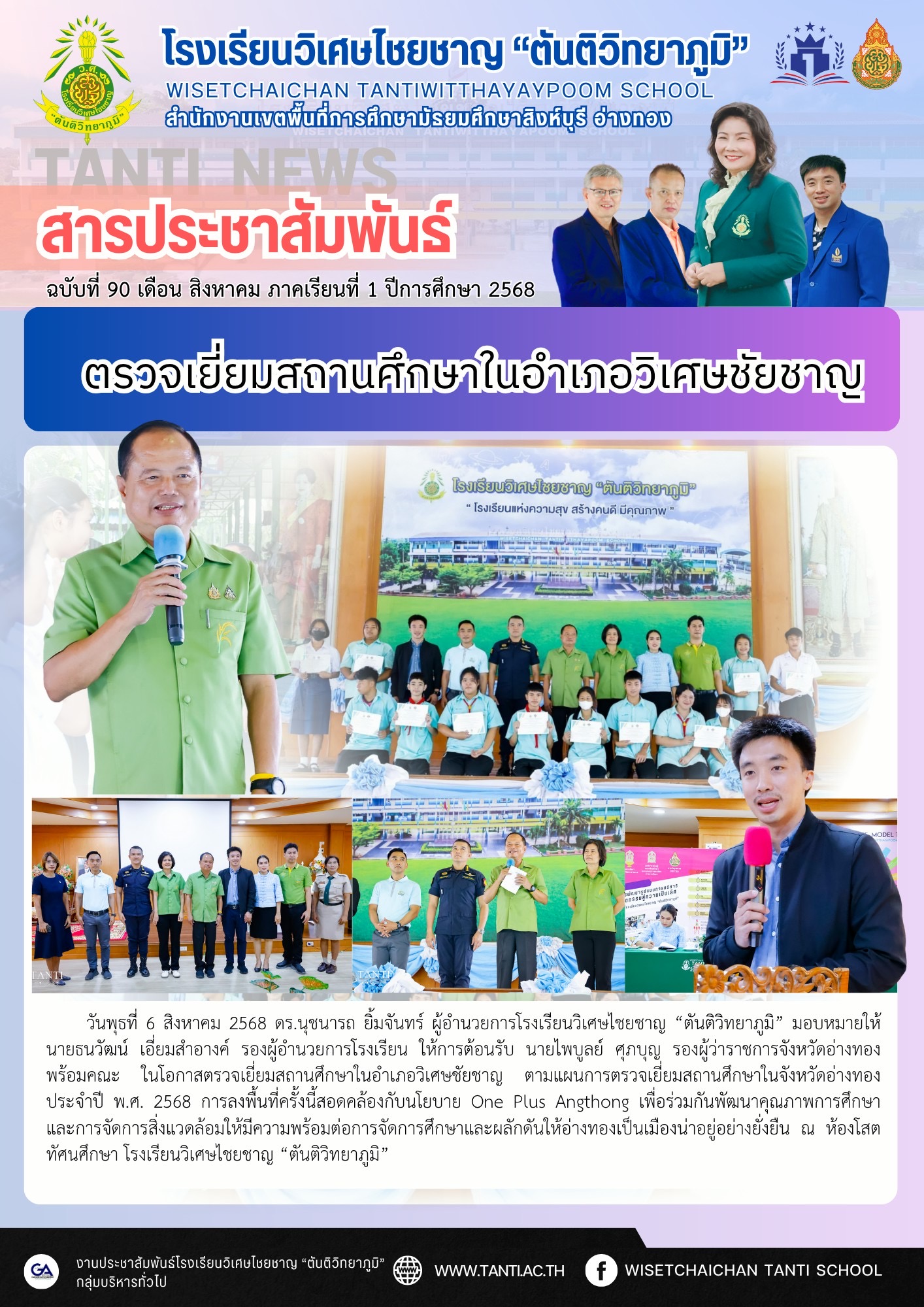 วันพุธที่ 6 สิงหาคม 2568 ดร.นุชนารถ ยิ้มจันทร์ ผู้อำนวยการโรงเรียนวิเศษไชยชาญ “ตันติวิทยาภูมิ” มอบหมายให้ นายธนวัฒน์ เอี่ยมสำอางค์ รองผู้อำนวยการโรงเรียน ให้การต้อนรับ นายไพบูลย์ ศุภบุญ รองผู้ว่าราชการจังหวัดอ่างทอง พร้อมคณะ ในโอกาสตรวจเยี่ยมสถานศึกษาในอำเภอวิเศษชัยชาญ ตามแผนการตรวจเยี่ยมสถานศึกษาในจังหวัดอ่างทอง ประจำปี พ.ศ. 2568 การลงพื้นที่ครั้งนี้สอดคล้องกับนโยบาย One Plus Angthong เพื่อร่วมกันพัฒนาคุณภาพการศึกษาและการจัดการสิ่งแวดล้อมให้มีความพร้อมต่อการจัดการศึกษาและผลักดันให้อ่างทองเป็นเมืองน่าอยู่อย่างยั่งยืน ณ ห้องโสตทัศนศึกษา โรงเรียนวิเศษไชยชาญ “ตันติวิทยาภูมิ”