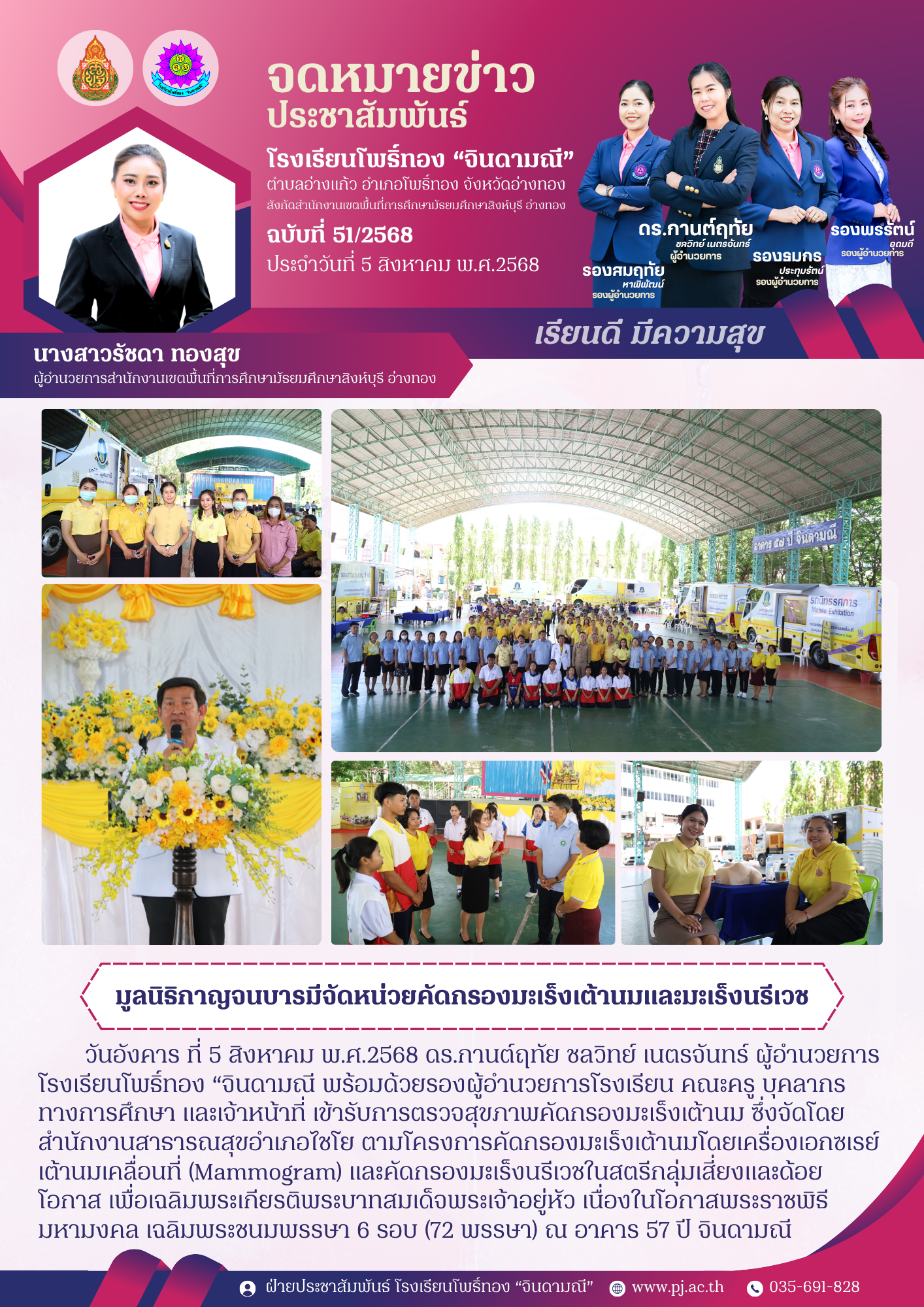 วันอังคาร ที่ 5 สิงหาคม พ.ศ.2568 ดร.กานต์ฤทัย ชลวิทย์ เนตรจันทร์ ผู้อำนวยการโรงเรียนโพธิ์ทอง “จินดามณี พร้อมด้วยรองผู้อำนวยการโรงเรียน คณะครู บุคลากรทางการศึกษา และเจ้าหน้าที่ เข้ารับการตรวจสุขภาพคัดกรองมะเร็งเต้านม ซึ่งจัดโดยสำนักงานสาธารณสุขอำเภอไชโย ตามโครงการคัดกรองมะเร็งเต้านมโดยเครื่องเอกซเรย์เต้านมเคลื่อนที่ (Mammogram) และคัดกรองมะเร็งนรีเวชในสตรีกลุ่มเสี่ยงและด้อยโอกาส เพื่อเฉลิมพระเกียรติพระบาทสมเด็จพระเจ้าอยู่หัว เนื่องในโอกาสพระราชพิธีมหามงคล เฉลิมพระชนมพรรษา 6 รอบ (72 พรรษา) ณ อาคาร 57 ปี จินดามณี