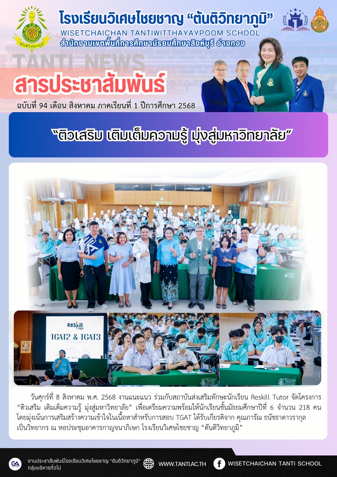 วันศุกร์ที่ 8 สิงหาคม พ.ศ. 2568 งานแนะแนว ร่วมกับสถาบันส่งเสริมทักษะนักเรียน Reskill Tutor จัดโครงการ “ติวเสริม เติมเต็มความรู้ มุ่งสู่มหาวิทยาลัย” เพื่อเตรียมความพร้อมให้นักเรียนชั้นมัธยมศึกษาปีที่ 6 จำนวน 218 คน โดยมุ่งเน้นการเสริมสร้างความเข้าใจในเนื้อหาสำหรับการสอบ TGAT ได้รับเกียรติจาก คุณภารัณ ธนัชธาดาวรากุล เป็นวิทยากร ณ หอประชุมอาคารกาญจนาภิเษก โรงเรียนวิเศษไชยชาญ “ตันติวิทยาภูมิ”