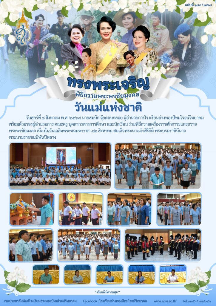 วันศุกร์ที่ ๘ สิงหาคม พ.ศ. ๒๕๖๘ นายสมนึก จุ้ยดอนกลอย ผู้อำนวยการโรงเรียนอ่างทองปัทมโรจน์วิทยาคม พร้อมด้วยรองผู้อำนวยการ คณะครู บุคลากรทางการศึกษา และนักเรียน ร่วมพิธีถวายเครื่องราชสักการะและถวายพระพรชัยมงคล เนื่องในวันเฉลิมพระชนมพรรษา ๑๒ สิงหาคม สมเด็จพระนางเจ้าสิริกิติ์ พระบรมราชินีนาถพระบรมราชชนนีพันปีหลวง